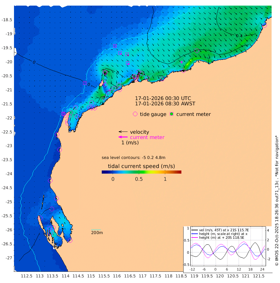 5cm/s 34T +12cm/s rms + 5cm/s -173T. NWSBAR 206m 4cm/s 51T +22cm/s rms + 10cm/s -148T. TAN100 109m 10cm/s 109T +11cm/s rms + 8cm/s -129T. PIL200 208m 16cm/s 128T +13cm/s rms + 7cm/s -137T. PIL100 105m 19cm/s 132T +12cm/s rms + 2cm/s -92T. PIL050 55m 5cm/s 49T +18cm/s rms + 4cm/s -149T. NRSNIN 61m 25cm/s 123T +6cm/s rms + 3cm/s 112T. NW Shelf M6 65m -30cm Withnell Point -47cm Denham -46cm Shark Bay (Inr Bn) -48cm Shark Bay -49cm Useless Loop -5cm Hamelin Pool -22cm Carnarvon -12cm Cape Cuvier -11cm Coral Bay -8cm Norwegian Bay -19cm Badjirrajirra -10cm Tantabiddi -16cm Point Murat -18cm Exmouth -14cm Learmonth -11cm Y Island -10cm North Muiron Island -5cm Roller -7cm Ashburton North -9cm Onslow (Beadon Creek) -8cm Thevenard Island -4cm Large Island -12cm North Sandy Island -7cm Barrow Island (Wapet Landing) -18cm Barrow Island (Tanker Mooring) 6cm Withnell Bay -13cm Trimouille Island -7cm North West Island 18cm Fortescue Road -5cm Steamboat Island -9cm Sholl Island 6cm Fairway Beacon 9cm Mawby Island 6cm Dampier (King Bay) 9cm Cape Legendre 7cm Hauy Island 8cm Port Walcott (Cape Lambert) 12cm Depuch Island 18cm Port Hedland 20cm Bedout Island 168cm Lagrange Bay