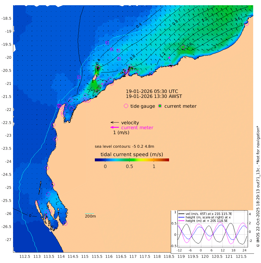 6cm/s -102T +12cm/s rms + 5cm/s -173T. NWSBAR 206m 1cm/s -123T +22cm/s rms + 10cm/s -148T. TAN100 109m 8cm/s -74T +11cm/s rms + 8cm/s -129T. PIL200 208m 12cm/s -48T +13cm/s rms + 7cm/s -137T. PIL100 105m 14cm/s -39T +12cm/s rms + 2cm/s -92T. PIL050 55m 1cm/s -58T +18cm/s rms + 4cm/s -149T. NRSNIN 61m 20cm/s -41T +6cm/s rms + 3cm/s 112T. NW Shelf M6 65m 6cm Withnell Point -3cm Denham -7cm Shark Bay (Inr Bn) -8cm Shark Bay -18cm Useless Loop -19cm Hamelin Pool 19cm Carnarvon 9cm Cape Cuvier 9cm Coral Bay 11cm Norwegian Bay 47cm Badjirrajirra 13cm Tantabiddi 31cm Point Murat 40cm Exmouth 53cm Learmonth 31cm Y Island 21cm North Muiron Island 24cm Roller 31cm Ashburton North 35cm Onslow (Beadon Creek) 31cm Thevenard Island 101cm Large Island 91cm North Sandy Island 54cm Barrow Island (Wapet Landing) 85cm Barrow Island (Tanker Mooring) 72cm Withnell Bay 54cm Trimouille Island 39cm North West Island 112cm Fortescue Road 73cm Steamboat Island 85cm Sholl Island 73cm Fairway Beacon 73cm Mawby Island 74cm Dampier (King Bay) 68cm Cape Legendre 90cm Hauy Island 99cm Port Walcott (Cape Lambert) 120cm Depuch Island 122cm Port Hedland 95cm Bedout Island 140cm Lagrange Bay