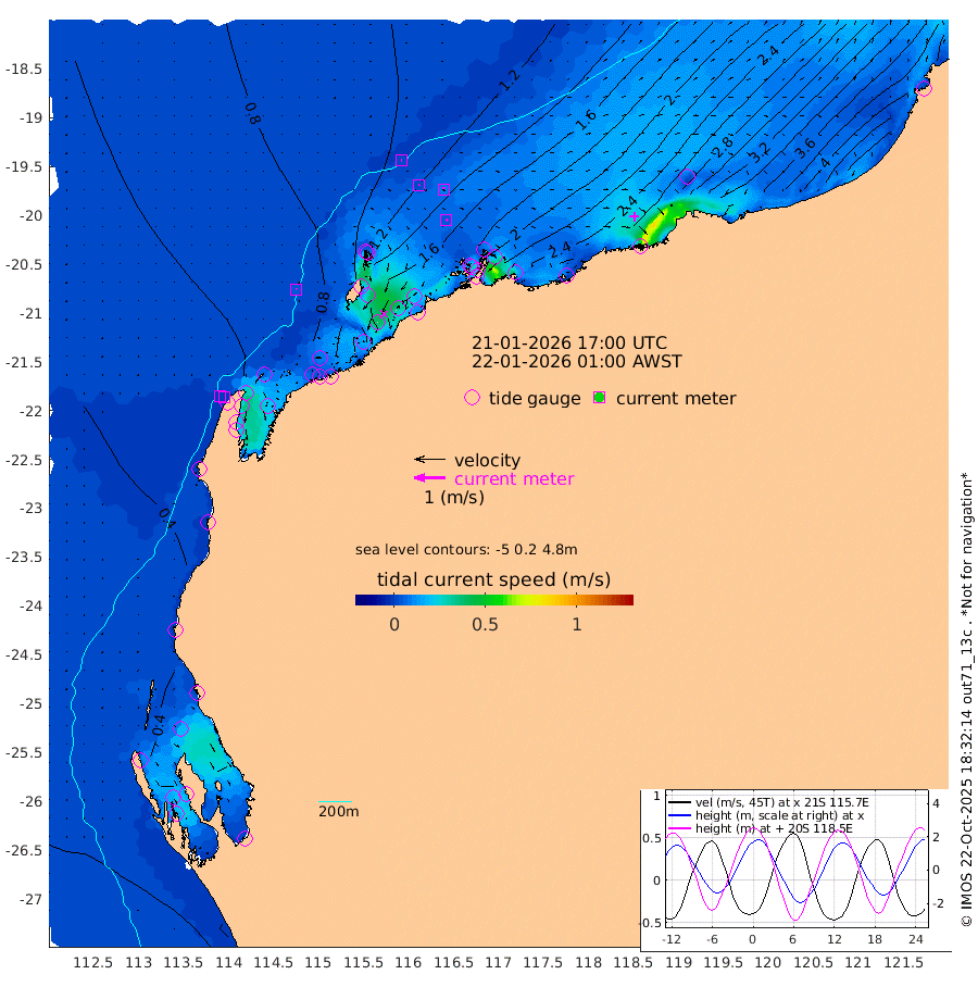 4cm/s -39T +12cm/s rms + 5cm/s -173T. NWSBAR 206m 0cm/s 15T +22cm/s rms + 10cm/s -148T. TAN100 109m 2cm/s 82T +11cm/s rms + 8cm/s -129T. PIL200 208m 3cm/s 48T +13cm/s rms + 7cm/s -137T. PIL100 105m 5cm/s 43T +12cm/s rms + 2cm/s -92T. PIL050 55m 0cm/s -94T +18cm/s rms + 4cm/s -149T. NRSNIN 61m 9cm/s 21T +6cm/s rms + 3cm/s 112T. NW Shelf M6 65m 39cm Withnell Point 35cm Denham 33cm Shark Bay (Inr Bn) 38cm Shark Bay 27cm Useless Loop -9cm Hamelin Pool 53cm Carnarvon 38cm Cape Cuvier 42cm Coral Bay 44cm Norwegian Bay 104cm Badjirrajirra 52cm Tantabiddi 78cm Point Murat 93cm Exmouth 102cm Learmonth 92cm Y Island 69cm North Muiron Island 81cm Roller 85cm Ashburton North 93cm Onslow (Beadon Creek) 89cm Thevenard Island 143cm Large Island 161cm North Sandy Island 124cm Barrow Island (Wapet Landing) 160cm Barrow Island (Tanker Mooring) 172cm Withnell Bay 112cm Trimouille Island 104cm North West Island 164cm Fortescue Road 173cm Steamboat Island 160cm Sholl Island 169cm Fairway Beacon 171cm Mawby Island 172cm Dampier (King Bay) 166cm Cape Legendre 189cm Hauy Island 213cm Port Walcott (Cape Lambert) 242cm Depuch Island 262cm Port Hedland 256cm Bedout Island 349cm Lagrange Bay