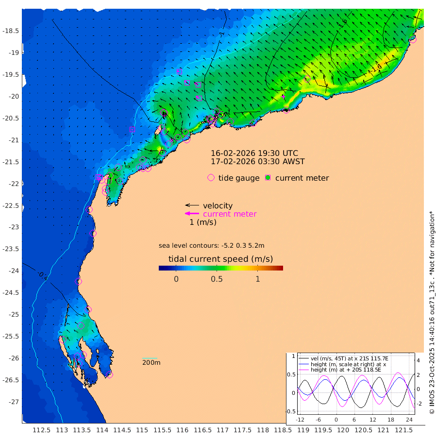 6cm/s -134T +12cm/s rms + 5cm/s -173T. NWSBAR 206m 11cm/s -139T +22cm/s rms + 10cm/s -148T. TAN100 109m 13cm/s -70T +11cm/s rms + 8cm/s -129T. PIL200 208m 24cm/s -55T +13cm/s rms + 7cm/s -137T. PIL100 105m 30cm/s -54T +12cm/s rms + 2cm/s -92T. PIL050 55m 12cm/s -137T +18cm/s rms + 4cm/s -149T. NRSNIN 61m 30cm/s -65T +6cm/s rms + 3cm/s 112T. NW Shelf M6 65m -21cm Withnell Point 1cm Denham 4cm Shark Bay (Inr Bn) -2cm Shark Bay 12cm Useless Loop 19cm Hamelin Pool -43cm Carnarvon -45cm Cape Cuvier -47cm Coral Bay -49cm Norwegian Bay -53cm Badjirrajirra -50cm Tantabiddi -49cm Point Murat -50cm Exmouth -50cm Learmonth -59cm Y Island -53cm North Muiron Island -60cm Roller -63cm Ashburton North -62cm Onslow (Beadon Creek) -64cm Thevenard Island -68cm Large Island -71cm North Sandy Island -71cm Barrow Island (Wapet Landing) -65cm Barrow Island (Tanker Mooring) -100cm Withnell Bay -58cm Trimouille Island -65cm North West Island -90cm Fortescue Road -94cm Steamboat Island -59cm Sholl Island -98cm Fairway Beacon -103cm Mawby Island -100cm Dampier (King Bay) -108cm Cape Legendre -96cm Hauy Island -111cm Port Walcott (Cape Lambert) -125cm Depuch Island -133cm Port Hedland -139cm Bedout Island -289cm Lagrange Bay
