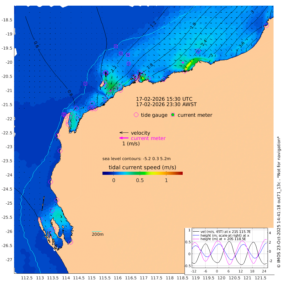 3cm/s -25T +12cm/s rms + 5cm/s -173T. NWSBAR 206m 2cm/s 37T +22cm/s rms + 10cm/s -148T. TAN100 109m 4cm/s 95T +11cm/s rms + 8cm/s -129T. PIL200 208m 5cm/s 96T +13cm/s rms + 7cm/s -137T. PIL100 105m 7cm/s 90T +12cm/s rms + 2cm/s -92T. PIL050 55m 1cm/s 35T +18cm/s rms + 4cm/s -149T. NRSNIN 61m 7cm/s 53T +6cm/s rms + 3cm/s 112T. NW Shelf M6 65m 37cm Withnell Point 34cm Denham 32cm Shark Bay (Inr Bn) 37cm Shark Bay 27cm Useless Loop -8cm Hamelin Pool 50cm Carnarvon 37cm Cape Cuvier 41cm Coral Bay 42cm Norwegian Bay 93cm Badjirrajirra 50cm Tantabiddi 71cm Point Murat 83cm Exmouth 93cm Learmonth 84cm Y Island 65cm North Muiron Island 76cm Roller 80cm Ashburton North 86cm Onslow (Beadon Creek) 84cm Thevenard Island 129cm Large Island 144cm North Sandy Island 113cm Barrow Island (Wapet Landing) 143cm Barrow Island (Tanker Mooring) 159cm Withnell Bay 104cm Trimouille Island 97cm North West Island 151cm Fortescue Road 156cm Steamboat Island 137cm Sholl Island 156cm Fairway Beacon 157cm Mawby Island 159cm Dampier (King Bay) 155cm Cape Legendre 172cm Hauy Island 196cm Port Walcott (Cape Lambert) 227cm Depuch Island 241cm Port Hedland 238cm Bedout Island 346cm Lagrange Bay