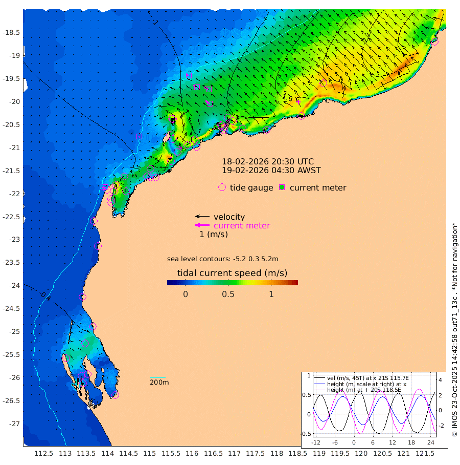 8cm/s -135T +12cm/s rms + 5cm/s -173T. NWSBAR 206m 12cm/s -140T +22cm/s rms + 10cm/s -148T. TAN100 109m 17cm/s -71T +11cm/s rms + 8cm/s -129T. PIL200 208m 29cm/s -56T +13cm/s rms + 7cm/s -137T. PIL100 105m 36cm/s -54T +12cm/s rms + 2cm/s -92T. PIL050 55m 12cm/s -135T +18cm/s rms + 4cm/s -149T. NRSNIN 61m 34cm/s -63T +6cm/s rms + 3cm/s 112T. NW Shelf M6 65m -16cm Withnell Point 6cm Denham 8cm Shark Bay (Inr Bn) 3cm Shark Bay 14cm Useless Loop 14cm Hamelin Pool -41cm Carnarvon -45cm Cape Cuvier -49cm Coral Bay -49cm Norwegian Bay -61cm Badjirrajirra -53cm Tantabiddi -55cm Point Murat -57cm Exmouth -59cm Learmonth -67cm Y Island -59cm North Muiron Island -67cm Roller -72cm Ashburton North -72cm Onslow (Beadon Creek) -73cm Thevenard Island -63cm Large Island -88cm North Sandy Island -86cm Barrow Island (Wapet Landing) -80cm Barrow Island (Tanker Mooring) -129cm Withnell Bay -74cm Trimouille Island -76cm North West Island -88cm Fortescue Road -119cm Steamboat Island -85cm Sholl Island -125cm Fairway Beacon -131cm Mawby Island -128cm Dampier (King Bay) -136cm Cape Legendre -122cm Hauy Island -146cm Port Walcott (Cape Lambert) -159cm Depuch Island -180cm Port Hedland -199cm Bedout Island -309cm Lagrange Bay