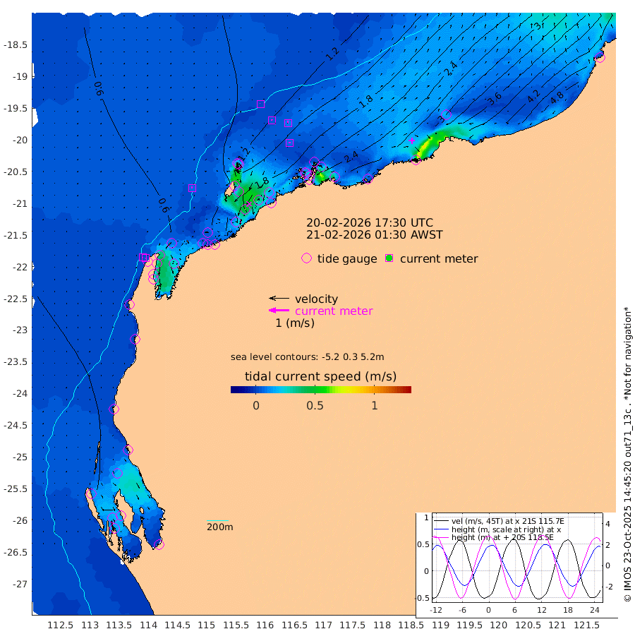 6cm/s -56T +12cm/s rms + 5cm/s -173T. NWSBAR 206m 1cm/s -147T +22cm/s rms + 10cm/s -148T. TAN100 109m 2cm/s 11T +11cm/s rms + 8cm/s -129T. PIL200 208m 4cm/s -11T +13cm/s rms + 7cm/s -137T. PIL100 105m 7cm/s -4T +12cm/s rms + 2cm/s -92T. PIL050 55m 1cm/s -125T +18cm/s rms + 4cm/s -149T. NRSNIN 61m 10cm/s -3T +6cm/s rms + 3cm/s 112T. NW Shelf M6 65m 27cm Withnell Point 16cm Denham 13cm Shark Bay (Inr Bn) 18cm Shark Bay 2cm Useless Loop -16cm Hamelin Pool 46cm Carnarvon 31cm Cape Cuvier 34cm Coral Bay 37cm Norwegian Bay 109cm Badjirrajirra 46cm Tantabiddi 77cm Point Murat 95cm Exmouth 111cm Learmonth 90cm Y Island 64cm North Muiron Island 80cm Roller 84cm Ashburton North 94cm Onslow (Beadon Creek) 88cm Thevenard Island 126cm Large Island 180cm North Sandy Island 130cm Barrow Island (Wapet Landing) 176cm Barrow Island (Tanker Mooring) 185cm Withnell Bay 120cm Trimouille Island 105cm North West Island 147cm Fortescue Road 186cm Steamboat Island 189cm Sholl Island 182cm Fairway Beacon 186cm Mawby Island 185cm Dampier (King Bay) 181cm Cape Legendre 209cm Hauy Island 235cm Port Walcott (Cape Lambert) 265cm Depuch Island 292cm Port Hedland 273cm Bedout Island 310cm Lagrange Bay