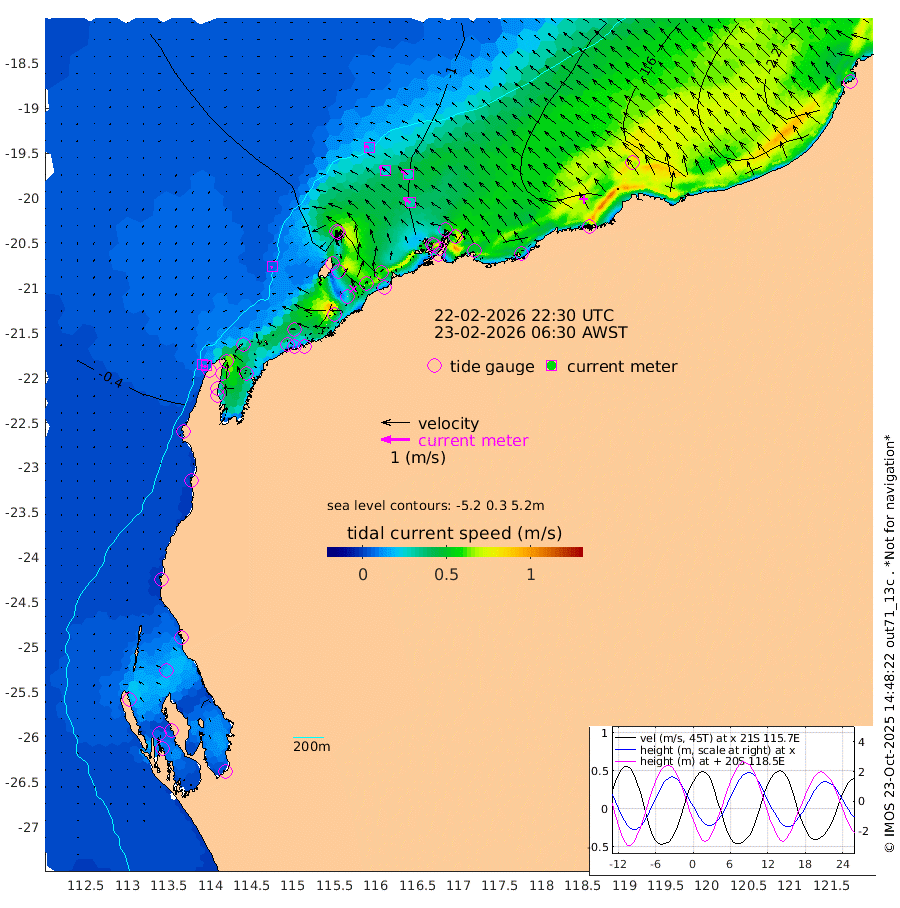 8cm/s -125T +12cm/s rms + 5cm/s -173T. NWSBAR 206m 8cm/s -140T +22cm/s rms + 10cm/s -148T. TAN100 109m 15cm/s -72T +11cm/s rms + 8cm/s -129T. PIL200 208m 25cm/s -57T +13cm/s rms + 7cm/s -137T. PIL100 105m 31cm/s -55T +12cm/s rms + 2cm/s -92T. PIL050 55m 8cm/s -133T +18cm/s rms + 4cm/s -149T. NRSNIN 61m 27cm/s -59T +6cm/s rms + 3cm/s 112T. NW Shelf M6 65m -11cm Withnell Point -4cm Denham -6cm Shark Bay (Inr Bn) -6cm Shark Bay -7cm Useless Loop -2cm Hamelin Pool -26cm Carnarvon -31cm Cape Cuvier -36cm Coral Bay -34cm Norwegian Bay -53cm Badjirrajirra -41cm Tantabiddi -44cm Point Murat -48cm Exmouth -50cm Learmonth -56cm Y Island -48cm North Muiron Island -53cm Roller -60cm Ashburton North -61cm Onslow (Beadon Creek) -61cm Thevenard Island -40cm Large Island -76cm North Sandy Island -75cm Barrow Island (Wapet Landing) -71cm Barrow Island (Tanker Mooring) -116cm Withnell Bay -72cm Trimouille Island -64cm North West Island -54cm Fortescue Road -110cm Steamboat Island -89cm Sholl Island -111cm Fairway Beacon -114cm Mawby Island -116cm Dampier (King Bay) -116cm Cape Legendre -107cm Hauy Island -135cm Port Walcott (Cape Lambert) -140cm Depuch Island -171cm Port Hedland -201cm Bedout Island -204cm Lagrange Bay