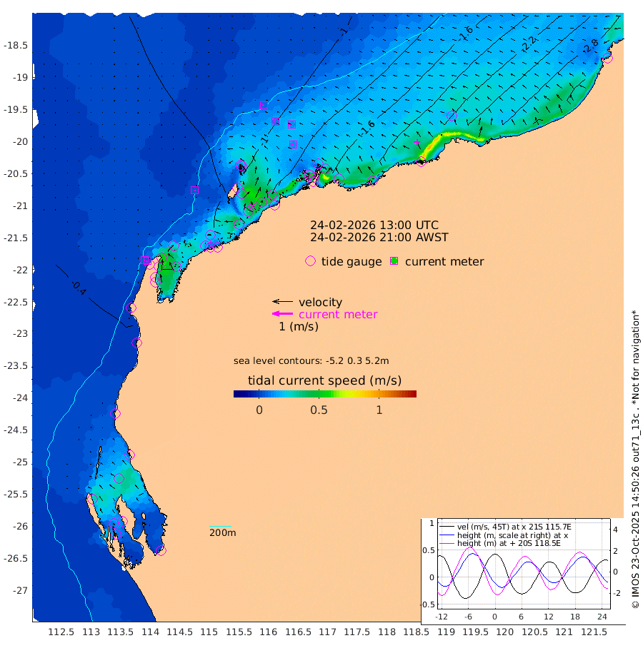 4cm/s 159T +12cm/s rms + 5cm/s -173T. NWSBAR 206m 5cm/s -135T +22cm/s rms + 10cm/s -148T. TAN100 109m 7cm/s -80T +11cm/s rms + 8cm/s -129T. PIL200 208m 10cm/s -69T +13cm/s rms + 7cm/s -137T. PIL100 105m 11cm/s -71T +12cm/s rms + 2cm/s -92T. PIL050 55m 5cm/s -135T +18cm/s rms + 4cm/s -149T. NRSNIN 61m 12cm/s -73T +6cm/s rms + 3cm/s 112T. NW Shelf M6 65m -18cm Withnell Point 8cm Denham 10cm Shark Bay (Inr Bn) 7cm Shark Bay 26cm Useless Loop 25cm Hamelin Pool -43cm Carnarvon -41cm Cape Cuvier -42cm Coral Bay -46cm Norwegian Bay -84cm Badjirrajirra -48cm Tantabiddi -64cm Point Murat -74cm Exmouth -87cm Learmonth -73cm Y Island -58cm North Muiron Island -70cm Roller -73cm Ashburton North -78cm Onslow (Beadon Creek) -75cm Thevenard Island -84cm Large Island -130cm North Sandy Island -101cm Barrow Island (Wapet Landing) -121cm Barrow Island (Tanker Mooring) -140cm Withnell Bay -99cm Trimouille Island -83cm North West Island -89cm Fortescue Road -139cm Steamboat Island -147cm Sholl Island -138cm Fairway Beacon -142cm Mawby Island -141cm Dampier (King Bay) -144cm Cape Legendre -150cm Hauy Island -170cm Port Walcott (Cape Lambert) -175cm Depuch Island -208cm Port Hedland -188cm Bedout Island -198cm Lagrange Bay