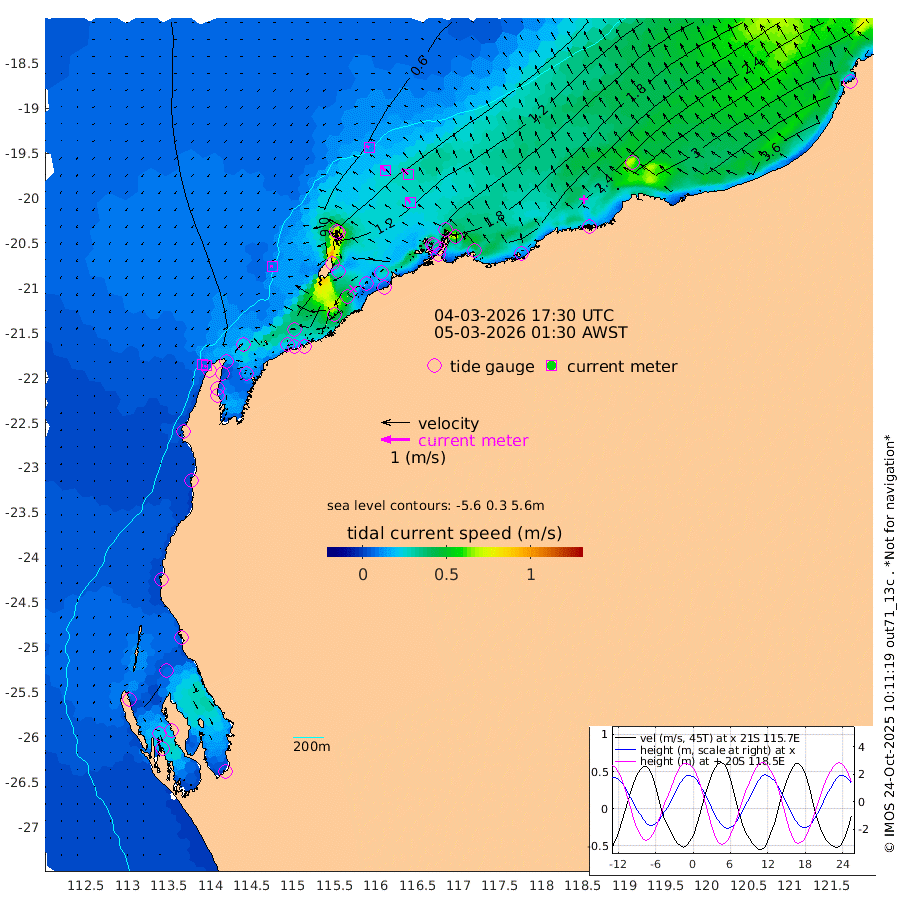 9cm/s -88T +12cm/s rms + 5cm/s -173T. NWSBAR 206m 7cm/s -138T +22cm/s rms + 10cm/s -148T. TAN100 109m 11cm/s -67T +11cm/s rms + 8cm/s -129T. PIL200 208m 20cm/s -46T +13cm/s rms + 7cm/s -137T. PIL100 105m 24cm/s -39T +12cm/s rms + 2cm/s -92T. PIL050 55m 7cm/s -131T +18cm/s rms + 4cm/s -149T. NRSNIN 61m 29cm/s -47T +6cm/s rms + 3cm/s 112T. NW Shelf M6 65m 26cm Withnell Point 27cm Denham 25cm Shark Bay (Inr Bn) 26cm Shark Bay 16cm Useless Loop -10cm Hamelin Pool 34cm Carnarvon 14cm Cape Cuvier 15cm Coral Bay 17cm Norwegian Bay 87cm Badjirrajirra 24cm Tantabiddi 57cm Point Murat 74cm Exmouth 92cm Learmonth 60cm Y Island 39cm North Muiron Island 50cm Roller 55cm Ashburton North 65cm Onslow (Beadon Creek) 58cm Thevenard Island 102cm Large Island 149cm North Sandy Island 97cm Barrow Island (Wapet Landing) 149cm Barrow Island (Tanker Mooring) 130cm Withnell Bay 99cm Trimouille Island 72cm North West Island 108cm Fortescue Road 131cm Steamboat Island 155cm Sholl Island 129cm Fairway Beacon 129cm Mawby Island 131cm Dampier (King Bay) 127cm Cape Legendre 157cm Hauy Island 174cm Port Walcott (Cape Lambert) 193cm Depuch Island 215cm Port Hedland 187cm Bedout Island 137cm Lagrange Bay