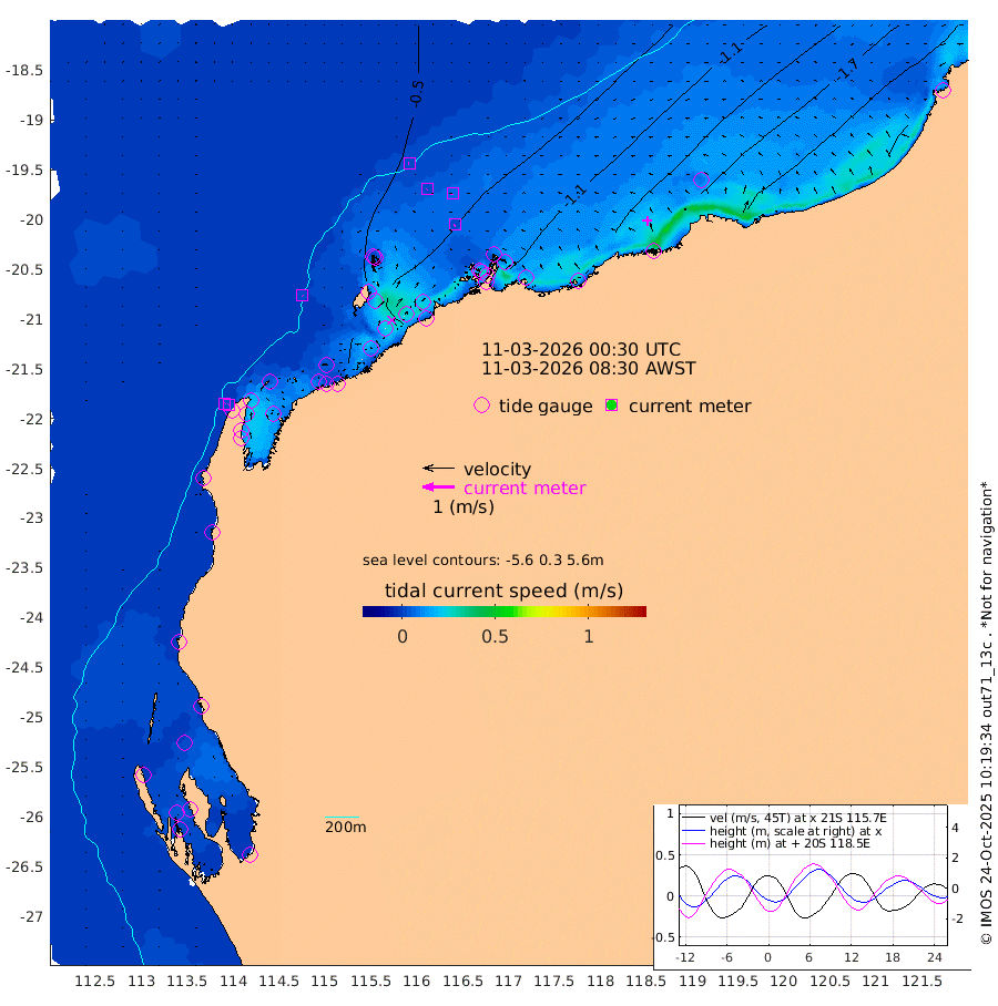 2cm/s 132T +12cm/s rms + 5cm/s -173T. NWSBAR 206m 1cm/s 53T +22cm/s rms + 10cm/s -148T. TAN100 109m 2cm/s -93T +11cm/s rms + 8cm/s -129T. PIL200 208m 2cm/s -155T +13cm/s rms + 7cm/s -137T. PIL100 105m 3cm/s -127T +12cm/s rms + 2cm/s -92T. PIL050 55m 2cm/s 50T +18cm/s rms + 4cm/s -149T. NRSNIN 61m 6cm/s -122T +6cm/s rms + 3cm/s 112T. NW Shelf M6 65m -11cm Withnell Point -16cm Denham -17cm Shark Bay (Inr Bn) -16cm Shark Bay -19cm Useless Loop -5cm Hamelin Pool -17cm Carnarvon -11cm Cape Cuvier -13cm Coral Bay -15cm Norwegian Bay -51cm Badjirrajirra -19cm Tantabiddi -34cm Point Murat -44cm Exmouth -50cm Learmonth -46cm Y Island -30cm North Muiron Island -39cm Roller -39cm Ashburton North -44cm Onslow (Beadon Creek) -40cm Thevenard Island -57cm Large Island -84cm North Sandy Island -61cm Barrow Island (Wapet Landing) -81cm Barrow Island (Tanker Mooring) -87cm Withnell Bay -53cm Trimouille Island -46cm North West Island -73cm Fortescue Road -83cm Steamboat Island -92cm Sholl Island -85cm Fairway Beacon -89cm Mawby Island -87cm Dampier (King Bay) -81cm Cape Legendre -94cm Hauy Island -111cm Port Walcott (Cape Lambert) -120cm Depuch Island -141cm Port Hedland -143cm Bedout Island -176cm Lagrange Bay