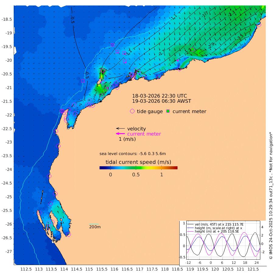7cm/s 86T +12cm/s rms + 5cm/s -173T. NWSBAR 206m 2cm/s 43T +22cm/s rms + 10cm/s -148T. TAN100 109m 8cm/s 107T +11cm/s rms + 8cm/s -129T. PIL200 208m 14cm/s 134T +13cm/s rms + 7cm/s -137T. PIL100 105m 16cm/s 142T +12cm/s rms + 2cm/s -92T. PIL050 55m 3cm/s 65T +18cm/s rms + 4cm/s -149T. NRSNIN 61m 17cm/s 150T +6cm/s rms + 3cm/s 112T. NW Shelf M6 65m -25cm Withnell Point -27cm Denham -21cm Shark Bay (Inr Bn) -26cm Shark Bay -15cm Useless Loop 12cm Hamelin Pool -38cm Carnarvon -21cm Cape Cuvier -22cm Coral Bay -23cm Norwegian Bay -87cm Badjirrajirra -31cm Tantabiddi -60cm Point Murat -76cm Exmouth -88cm Learmonth -68cm Y Island -46cm North Muiron Island -58cm Roller -62cm Ashburton North -71cm Onslow (Beadon Creek) -65cm Thevenard Island -122cm Large Island -154cm North Sandy Island -101cm Barrow Island (Wapet Landing) -148cm Barrow Island (Tanker Mooring) -139cm Withnell Bay -91cm Trimouille Island -81cm North West Island -143cm Fortescue Road -141cm Steamboat Island -146cm Sholl Island -138cm Fairway Beacon -140cm Mawby Island -140cm Dampier (King Bay) -131cm Cape Legendre -164cm Hauy Island -183cm Port Walcott (Cape Lambert) -214cm Depuch Island -226cm Port Hedland -209cm Bedout Island -246cm Lagrange Bay