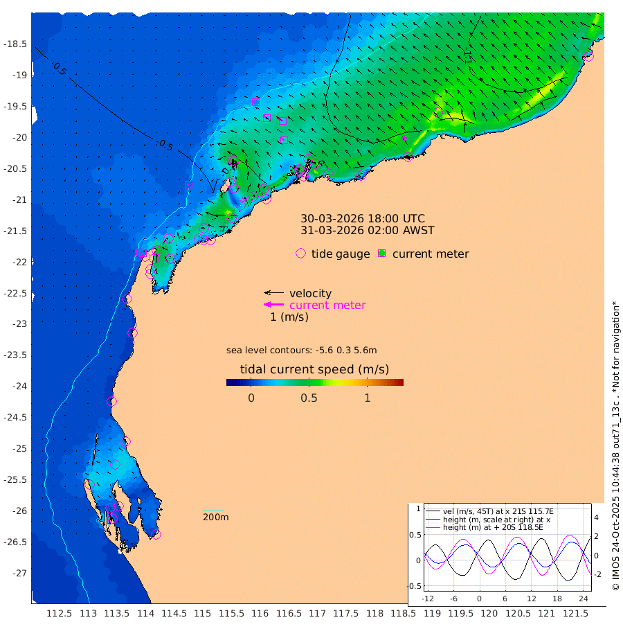 7cm/s -127T +12cm/s rms + 5cm/s -173T. NWSBAR 206m 8cm/s -136T +22cm/s rms + 10cm/s -148T. TAN100 109m 13cm/s -69T +11cm/s rms + 8cm/s -129T. PIL200 208m 22cm/s -54T +13cm/s rms + 7cm/s -137T. PIL100 105m 27cm/s -52T +12cm/s rms + 2cm/s -92T. PIL050 55m 9cm/s -135T +18cm/s rms + 4cm/s -149T. NRSNIN 61m 21cm/s -56T +6cm/s rms + 3cm/s 112T. NW Shelf M6 65m -8cm Withnell Point 7cm Denham 9cm Shark Bay (Inr Bn) 2cm Shark Bay 12cm Useless Loop 11cm Hamelin Pool -25cm Carnarvon -30cm Cape Cuvier -32cm Coral Bay -34cm Norwegian Bay -32cm Badjirrajirra -34cm Tantabiddi -31cm Point Murat -31cm Exmouth -28cm Learmonth -37cm Y Island -35cm North Muiron Island -36cm Roller -43cm Ashburton North -41cm Onslow (Beadon Creek) -44cm Thevenard Island -43cm Large Island -39cm North Sandy Island -47cm Barrow Island (Wapet Landing) -35cm Barrow Island (Tanker Mooring) -69cm Withnell Bay -39cm Trimouille Island -41cm North West Island -62cm Fortescue Road -57cm Steamboat Island -41cm Sholl Island -66cm Fairway Beacon -67cm Mawby Island -70cm Dampier (King Bay) -77cm Cape Legendre -62cm Hauy Island -75cm Port Walcott (Cape Lambert) -69cm Depuch Island -91cm Port Hedland -110cm Bedout Island -179cm Lagrange Bay