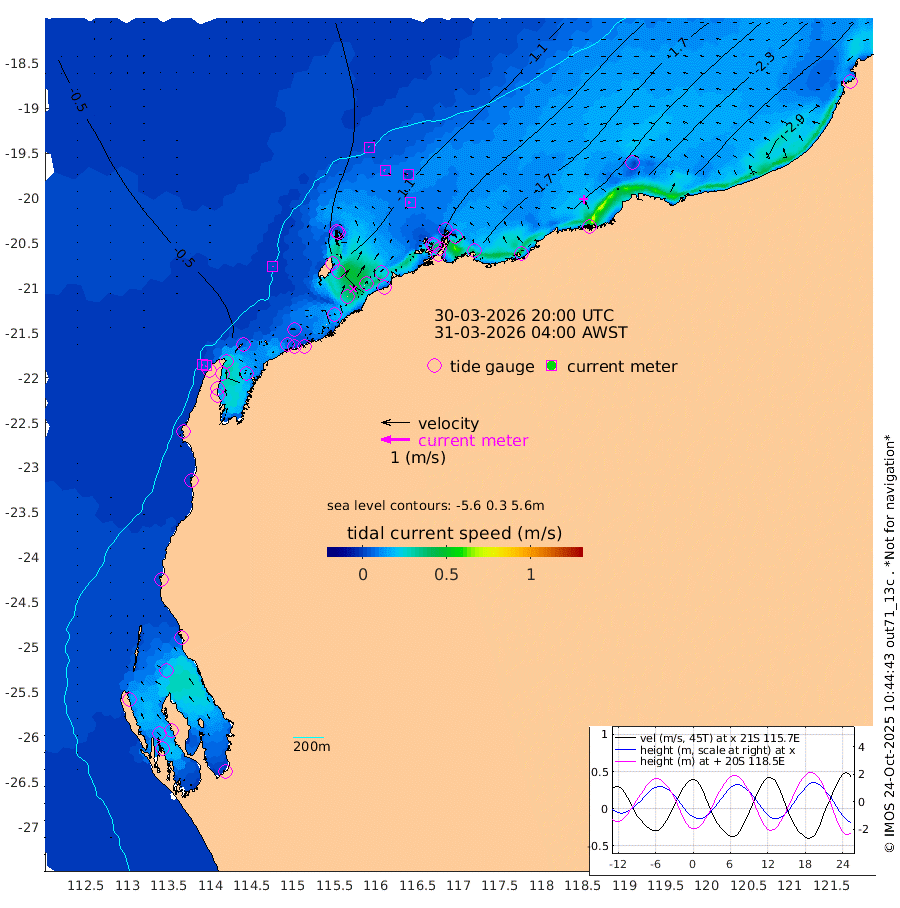 2cm/s 174T +12cm/s rms + 5cm/s -173T. NWSBAR 206m 4cm/s -134T +22cm/s rms + 10cm/s -148T. TAN100 109m 3cm/s -55T +11cm/s rms + 8cm/s -129T. PIL200 208m 6cm/s -67T +13cm/s rms + 7cm/s -137T. PIL100 105m 9cm/s -73T +12cm/s rms + 2cm/s -92T. PIL050 55m 4cm/s -144T +18cm/s rms + 4cm/s -149T. NRSNIN 61m 3cm/s -114T +6cm/s rms + 3cm/s 112T. NW Shelf M6 65m -24cm Withnell Point -16cm Denham -13cm Shark Bay (Inr Bn) -19cm Shark Bay -6cm Useless Loop 14cm Hamelin Pool -42cm Carnarvon -33cm Cape Cuvier -35cm Coral Bay -36cm Norwegian Bay -75cm Badjirrajirra -42cm Tantabiddi -59cm Point Murat -67cm Exmouth -74cm Learmonth -65cm Y Island -51cm North Muiron Island -58cm Roller -67cm Ashburton North -72cm Onslow (Beadon Creek) -70cm Thevenard Island -86cm Large Island -120cm North Sandy Island -95cm Barrow Island (Wapet Landing) -116cm Barrow Island (Tanker Mooring) -133cm Withnell Bay -88cm Trimouille Island -78cm North West Island -105cm Fortescue Road -128cm Steamboat Island -116cm Sholl Island -130cm Fairway Beacon -130cm Mawby Island -134cm Dampier (King Bay) -137cm Cape Legendre -144cm Hauy Island -164cm Port Walcott (Cape Lambert) -180cm Depuch Island -201cm Port Hedland -205cm Bedout Island -217cm Lagrange Bay