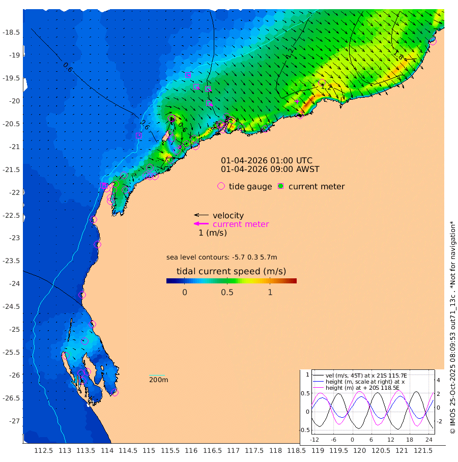 7cm/s 49T +12cm/s rms + 5cm/s -173T. NWSBAR 206m 10cm/s 43T +22cm/s rms + 10cm/s -148T. TAN100 109m 15cm/s 109T +11cm/s rms + 8cm/s -129T. PIL200 208m 27cm/s 123T +13cm/s rms + 7cm/s -137T. PIL100 105m 32cm/s 125T +12cm/s rms + 2cm/s -92T. PIL050 55m 10cm/s 48T +18cm/s rms + 4cm/s -149T. NRSNIN 61m 30cm/s 119T +6cm/s rms + 3cm/s 112T. NW Shelf M6 65m 12cm Withnell Point -7cm Denham -6cm Shark Bay (Inr Bn) -6cm Shark Bay -13cm Useless Loop -11cm Hamelin Pool 29cm Carnarvon 34cm Cape Cuvier 38cm Coral Bay 39cm Norwegian Bay 45cm Badjirrajirra 41cm Tantabiddi 41cm Point Murat 42cm Exmouth 48cm Learmonth 49cm Y Island 45cm North Muiron Island 50cm Roller 57cm Ashburton North 56cm Onslow (Beadon Creek) 58cm Thevenard Island 49cm Large Island 62cm North Sandy Island 67cm Barrow Island (Wapet Landing) 57cm Barrow Island (Tanker Mooring) 103cm Withnell Bay 59cm Trimouille Island 59cm North West Island 72cm Fortescue Road 87cm Steamboat Island 62cm Sholl Island 99cm Fairway Beacon 102cm Mawby Island 102cm Dampier (King Bay) 111cm Cape Legendre 94cm Hauy Island 116cm Port Walcott (Cape Lambert) 121cm Depuch Island 144cm Port Hedland 153cm Bedout Island 248cm Lagrange Bay