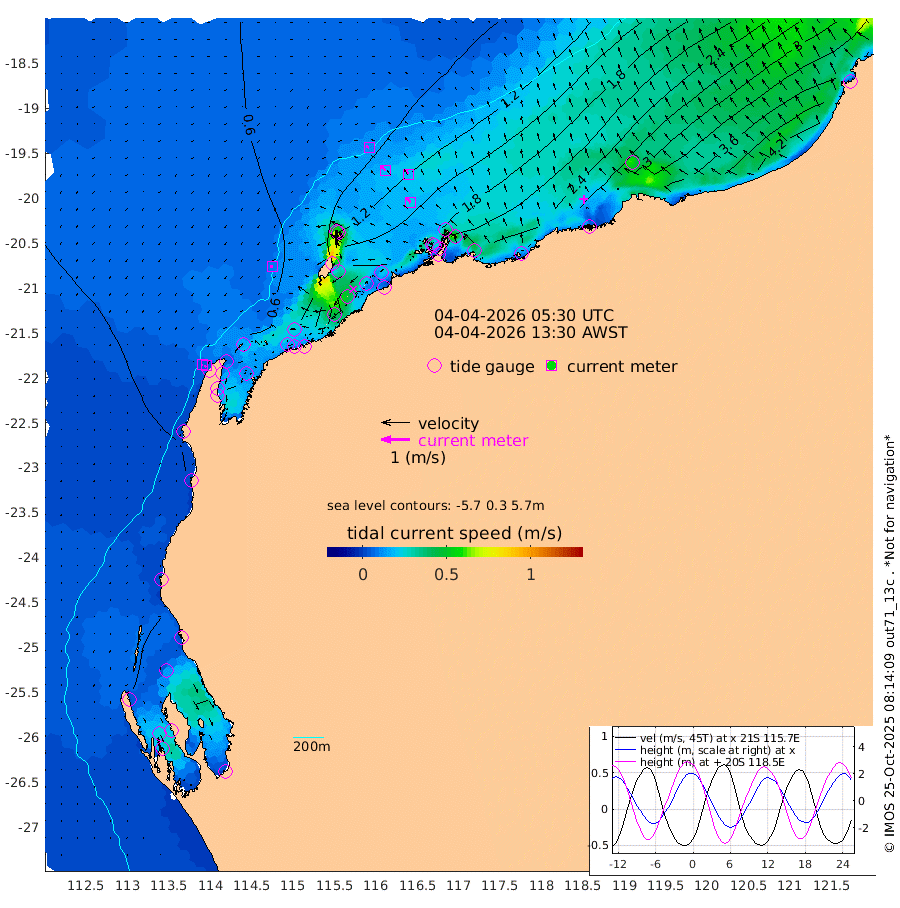 10cm/s -94T +12cm/s rms + 5cm/s -173T. NWSBAR 206m 5cm/s -136T +22cm/s rms + 10cm/s -148T. TAN100 109m 11cm/s -71T +11cm/s rms + 8cm/s -129T. PIL200 208m 20cm/s -42T +13cm/s rms + 7cm/s -137T. PIL100 105m 22cm/s -35T +12cm/s rms + 2cm/s -92T. PIL050 55m 6cm/s -127T +18cm/s rms + 4cm/s -149T. NRSNIN 61m 19cm/s -27T +6cm/s rms + 3cm/s 112T. NW Shelf M6 65m 37cm Withnell Point 43cm Denham 40cm Shark Bay (Inr Bn) 41cm Shark Bay 34cm Useless Loop -8cm Hamelin Pool 48cm Carnarvon 27cm Cape Cuvier 30cm Coral Bay 32cm Norwegian Bay 106cm Badjirrajirra 38cm Tantabiddi 73cm Point Murat 92cm Exmouth 108cm Learmonth 80cm Y Island 55cm North Muiron Island 66cm Roller 73cm Ashburton North 84cm Onslow (Beadon Creek) 76cm Thevenard Island 144cm Large Island 170cm North Sandy Island 117cm Barrow Island (Wapet Landing) 169cm Barrow Island (Tanker Mooring) 153cm Withnell Bay 110cm Trimouille Island 90cm North West Island 163cm Fortescue Road 152cm Steamboat Island 166cm Sholl Island 153cm Fairway Beacon 153cm Mawby Island 155cm Dampier (King Bay) 152cm Cape Legendre 177cm Hauy Island 200cm Port Walcott (Cape Lambert) 217cm Depuch Island 245cm Port Hedland 220cm Bedout Island 250cm Lagrange Bay