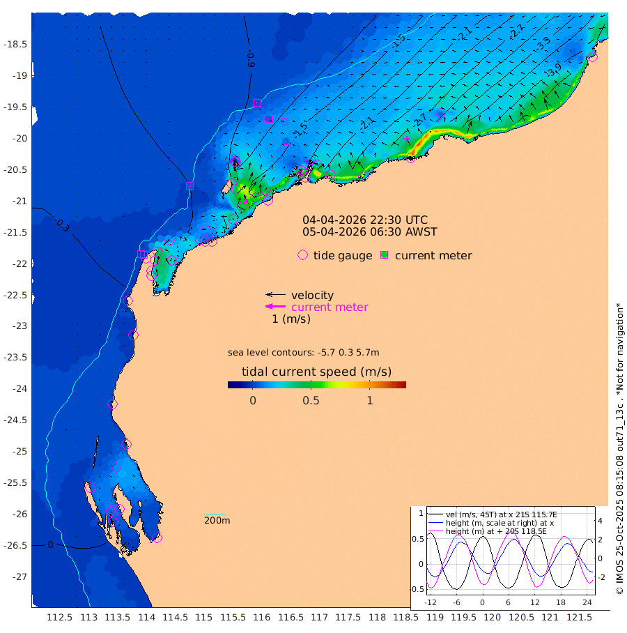 4cm/s 138T +12cm/s rms + 5cm/s -173T. NWSBAR 206m 1cm/s -129T +22cm/s rms + 10cm/s -148T. TAN100 109m 3cm/s -67T +11cm/s rms + 8cm/s -129T. PIL200 208m 4cm/s -93T +13cm/s rms + 7cm/s -137T. PIL100 105m 7cm/s -91T +12cm/s rms + 2cm/s -92T. PIL050 55m 0cm/s 105T +18cm/s rms + 4cm/s -149T. NRSNIN 61m 11cm/s -100T +6cm/s rms + 3cm/s 112T. NW Shelf M6 65m -11cm Withnell Point -10cm Denham -8cm Shark Bay (Inr Bn) -9cm Shark Bay -7cm Useless Loop 3cm Hamelin Pool -27cm Carnarvon -19cm Cape Cuvier -23cm Coral Bay -25cm Norwegian Bay -85cm Badjirrajirra -33cm Tantabiddi -59cm Point Murat -73cm Exmouth -87cm Learmonth -72cm Y Island -50cm North Muiron Island -63cm Roller -70cm Ashburton North -77cm Onslow (Beadon Creek) -72cm Thevenard Island -117cm Large Island -148cm North Sandy Island -109cm Barrow Island (Wapet Landing) -143cm Barrow Island (Tanker Mooring) -161cm Withnell Bay -97cm Trimouille Island -87cm North West Island -149cm Fortescue Road -156cm Steamboat Island -156cm Sholl Island -158cm Fairway Beacon -161cm Mawby Island -162cm Dampier (King Bay) -155cm Cape Legendre -178cm Hauy Island -207cm Port Walcott (Cape Lambert) -228cm Depuch Island -262cm Port Hedland -262cm Bedout Island -348cm Lagrange Bay