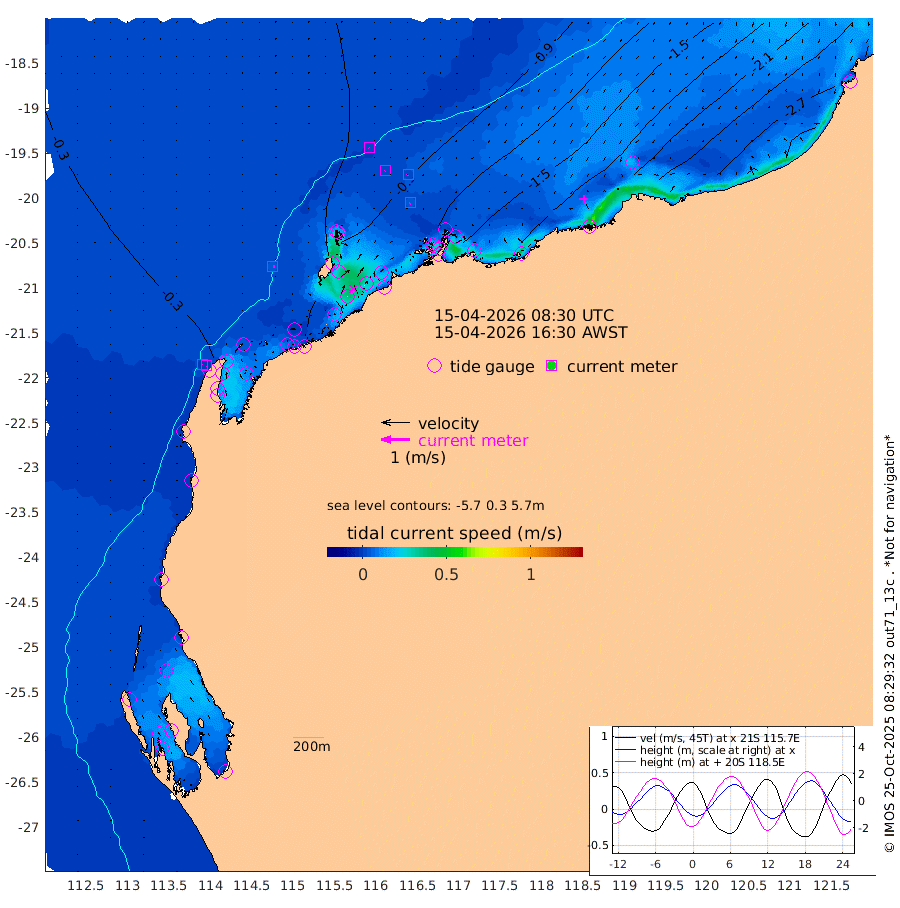5cm/s 106T +12cm/s rms + 5cm/s -173T. NWSBAR 206m 1cm/s -138T +22cm/s rms + 10cm/s -148T. TAN100 109m 1cm/s 128T +11cm/s rms + 8cm/s -129T. PIL200 208m 2cm/s -147T +13cm/s rms + 7cm/s -137T. PIL100 105m 5cm/s -137T +12cm/s rms + 2cm/s -92T. PIL050 55m 1cm/s -143T +18cm/s rms + 4cm/s -149T. NRSNIN 61m 3cm/s -135T +6cm/s rms + 3cm/s 112T. NW Shelf M6 65m -22cm Withnell Point -14cm Denham -13cm Shark Bay (Inr Bn) -12cm Shark Bay -3cm Useless Loop 12cm Hamelin Pool -33cm Carnarvon -22cm Cape Cuvier -24cm Coral Bay -27cm Norwegian Bay -66cm Badjirrajirra -31cm Tantabiddi -49cm Point Murat -59cm Exmouth -73cm Learmonth -56cm Y Island -42cm North Muiron Island -53cm Roller -55cm Ashburton North -61cm Onslow (Beadon Creek) -58cm Thevenard Island -91cm Large Island -116cm North Sandy Island -84cm Barrow Island (Wapet Landing) -111cm Barrow Island (Tanker Mooring) -121cm Withnell Bay -90cm Trimouille Island -65cm North West Island -107cm Fortescue Road -113cm Steamboat Island -107cm Sholl Island -118cm Fairway Beacon -116cm Mawby Island -120cm Dampier (King Bay) -119cm Cape Legendre -133cm Hauy Island -151cm Port Walcott (Cape Lambert) -186cm Depuch Island -189cm Port Hedland -173cm Bedout Island -253cm Lagrange Bay