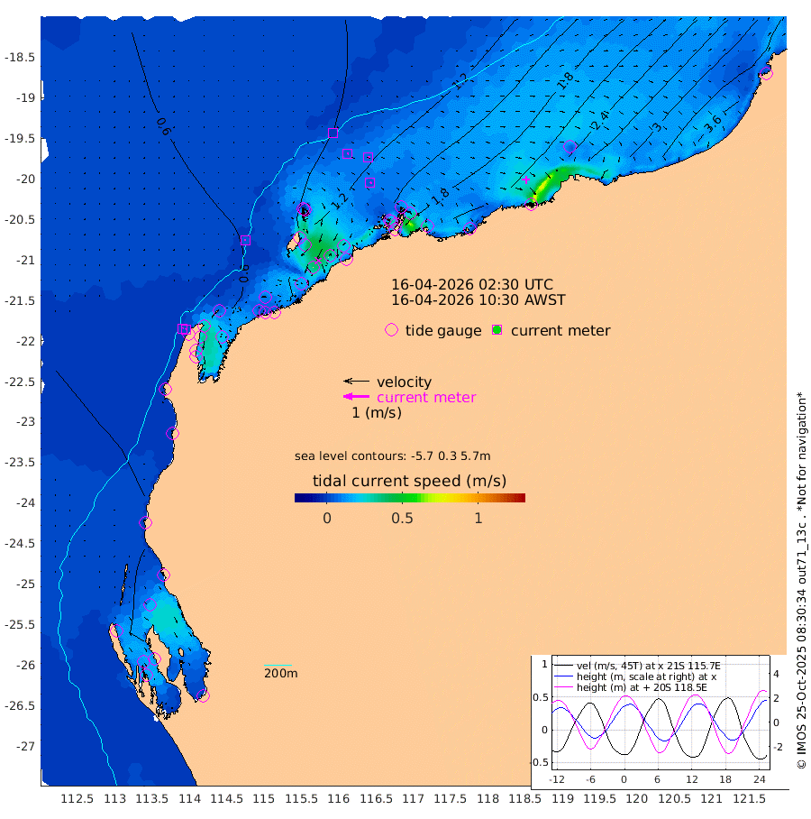 5cm/s -65T +12cm/s rms + 5cm/s -173T. NWSBAR 206m 2cm/s 40T +22cm/s rms + 10cm/s -148T. TAN100 109m 0cm/s 116T +11cm/s rms + 8cm/s -129T. PIL200 208m 4cm/s 80T +13cm/s rms + 7cm/s -137T. PIL100 105m 5cm/s 70T +12cm/s rms + 2cm/s -92T. PIL050 55m 3cm/s 41T +18cm/s rms + 4cm/s -149T. NRSNIN 61m 8cm/s 89T +6cm/s rms + 3cm/s 112T. NW Shelf M6 65m 28cm Withnell Point 21cm Denham 19cm Shark Bay (Inr Bn) 21cm Shark Bay 10cm Useless Loop -12cm Hamelin Pool 43cm Carnarvon 31cm Cape Cuvier 34cm Coral Bay 36cm Norwegian Bay 84cm Badjirrajirra 42cm Tantabiddi 63cm Point Murat 76cm Exmouth 85cm Learmonth 75cm Y Island 56cm North Muiron Island 69cm Roller 72cm Ashburton North 79cm Onslow (Beadon Creek) 75cm Thevenard Island 108cm Large Island 142cm North Sandy Island 106cm Barrow Island (Wapet Landing) 135cm Barrow Island (Tanker Mooring) 152cm Withnell Bay 103cm Trimouille Island 83cm North West Island 134cm Fortescue Road 142cm Steamboat Island 131cm Sholl Island 148cm Fairway Beacon 148cm Mawby Island 151cm Dampier (King Bay) 151cm Cape Legendre 163cm Hauy Island 188cm Port Walcott (Cape Lambert) 220cm Depuch Island 234cm Port Hedland 232cm Bedout Island 315cm Lagrange Bay