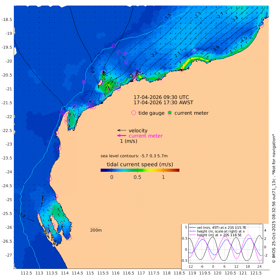 8cm/s 106T +12cm/s rms + 5cm/s -173T. NWSBAR 206m 2cm/s -142T +22cm/s rms + 10cm/s -148T. TAN100 109m 1cm/s 146T +11cm/s rms + 8cm/s -129T. PIL200 208m 4cm/s -154T +13cm/s rms + 7cm/s -137T. PIL100 105m 7cm/s -145T +12cm/s rms + 2cm/s -92T. PIL050 55m 2cm/s -149T +18cm/s rms + 4cm/s -149T. NRSNIN 61m 8cm/s -111T +6cm/s rms + 3cm/s 112T. NW Shelf M6 65m -45cm Withnell Point -29cm Denham -26cm Shark Bay (Inr Bn) -28cm Shark Bay -11cm Useless Loop 23cm Hamelin Pool -65cm Carnarvon -48cm Cape Cuvier -51cm Coral Bay -55cm Norwegian Bay -117cm Badjirrajirra -61cm Tantabiddi -89cm Point Murat -106cm Exmouth -122cm Learmonth -101cm Y Island -78cm North Muiron Island -95cm Roller -97cm Ashburton North -106cm Onslow (Beadon Creek) -101cm Thevenard Island -140cm Large Island -188cm North Sandy Island -140cm Barrow Island (Wapet Landing) -182cm Barrow Island (Tanker Mooring) -193cm Withnell Bay -142cm Trimouille Island -114cm North West Island -158cm Fortescue Road -193cm Steamboat Island -179cm Sholl Island -190cm Fairway Beacon -191cm Mawby Island -192cm Dampier (King Bay) -194cm Cape Legendre -212cm Hauy Island -239cm Port Walcott (Cape Lambert) -279cm Depuch Island -292cm Port Hedland -265cm Bedout Island -358cm Lagrange Bay