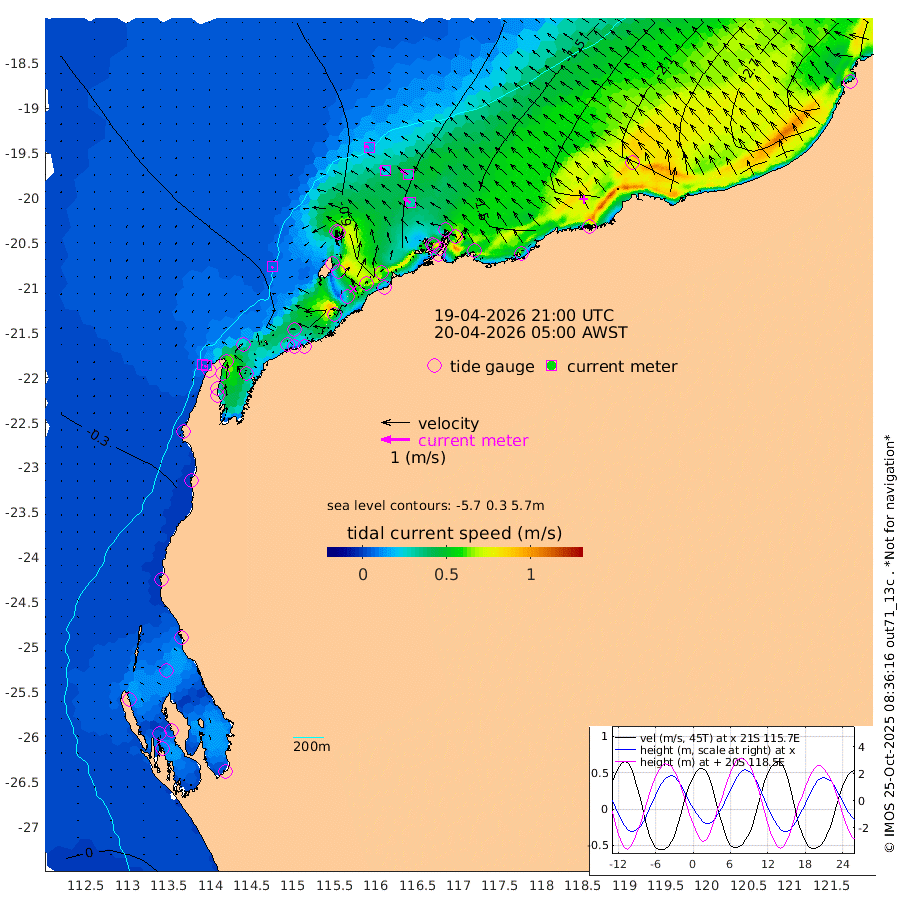 7cm/s -148T +12cm/s rms + 5cm/s -173T. NWSBAR 206m 6cm/s -137T +22cm/s rms + 10cm/s -148T. TAN100 109m 15cm/s -72T +11cm/s rms + 8cm/s -129T. PIL200 208m 24cm/s -59T +13cm/s rms + 7cm/s -137T. PIL100 105m 29cm/s -56T +12cm/s rms + 2cm/s -92T. PIL050 55m 5cm/s -132T +18cm/s rms + 4cm/s -149T. NRSNIN 61m 31cm/s -60T +6cm/s rms + 3cm/s 112T. NW Shelf M6 65m -4cm Withnell Point 2cm Denham -1cm Shark Bay (Inr Bn) -1cm Shark Bay -2cm Useless Loop -4cm Hamelin Pool -19cm Carnarvon -22cm Cape Cuvier -27cm Coral Bay -28cm Norwegian Bay -59cm Badjirrajirra -35cm Tantabiddi -45cm Point Murat -52cm Exmouth -58cm Learmonth -60cm Y Island -46cm North Muiron Island -56cm Roller -62cm Ashburton North -65cm Onslow (Beadon Creek) -64cm Thevenard Island -48cm Large Island -96cm North Sandy Island -86cm Barrow Island (Wapet Landing) -90cm Barrow Island (Tanker Mooring) -138cm Withnell Bay -80cm Trimouille Island -72cm North West Island -72cm Fortescue Road -128cm Steamboat Island -110cm Sholl Island -133cm Fairway Beacon -136cm Mawby Island -138cm Dampier (King Bay) -139cm Cape Legendre -138cm Hauy Island -168cm Port Walcott (Cape Lambert) -178cm Depuch Island -215cm Port Hedland -242cm Bedout Island -285cm Lagrange Bay