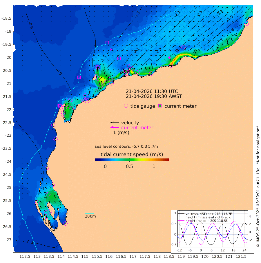 5cm/s 122T +12cm/s rms + 5cm/s -173T. NWSBAR 206m 5cm/s -140T +22cm/s rms + 10cm/s -148T. TAN100 109m 3cm/s -83T +11cm/s rms + 8cm/s -129T. PIL200 208m 5cm/s -99T +13cm/s rms + 7cm/s -137T. PIL100 105m 8cm/s -107T +12cm/s rms + 2cm/s -92T. PIL050 55m 5cm/s -140T +18cm/s rms + 4cm/s -149T. NRSNIN 61m 13cm/s -89T +6cm/s rms + 3cm/s 112T. NW Shelf M6 65m -47cm Withnell Point -20cm Denham -15cm Shark Bay (Inr Bn) -22cm Shark Bay 4cm Useless Loop 31cm Hamelin Pool -77cm Carnarvon -64cm Cape Cuvier -66cm Coral Bay -70cm Norwegian Bay -134cm Badjirrajirra -75cm Tantabiddi -104cm Point Murat -119cm Exmouth -135cm Learmonth -114cm Y Island -91cm North Muiron Island -107cm Roller -112cm Ashburton North -121cm Onslow (Beadon Creek) -116cm Thevenard Island -154cm Large Island -202cm North Sandy Island -155cm Barrow Island (Wapet Landing) -196cm Barrow Island (Tanker Mooring) -206cm Withnell Bay -151cm Trimouille Island -126cm North West Island -170cm Fortescue Road -206cm Steamboat Island -203cm Sholl Island -205cm Fairway Beacon -208cm Mawby Island -208cm Dampier (King Bay) -212cm Cape Legendre -224cm Hauy Island -253cm Port Walcott (Cape Lambert) -270cm Depuch Island -304cm Port Hedland -279cm Bedout Island -362cm Lagrange Bay