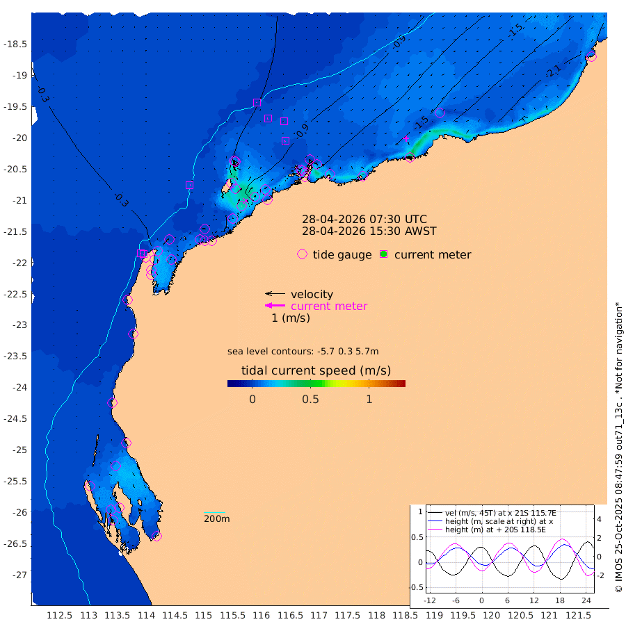 4cm/s 113T +12cm/s rms + 5cm/s -173T. NWSBAR 206m 2cm/s -135T +22cm/s rms + 10cm/s -148T. TAN100 109m 1cm/s -163T +11cm/s rms + 8cm/s -129T. PIL200 208m 3cm/s -103T +13cm/s rms + 7cm/s -137T. PIL100 105m 5cm/s -107T +12cm/s rms + 2cm/s -92T. PIL050 55m 2cm/s -138T +18cm/s rms + 4cm/s -149T. NRSNIN 61m 3cm/s -151T +6cm/s rms + 3cm/s 112T. NW Shelf M6 65m -21cm Withnell Point -10cm Denham -9cm Shark Bay (Inr Bn) -8cm Shark Bay 0cm Useless Loop 13cm Hamelin Pool -32cm Carnarvon -23cm Cape Cuvier -24cm Coral Bay -26cm Norwegian Bay -59cm Badjirrajirra -29cm Tantabiddi -44cm Point Murat -52cm Exmouth -66cm Learmonth -46cm Y Island -37cm North Muiron Island -44cm Roller -49cm Ashburton North -54cm Onslow (Beadon Creek) -51cm Thevenard Island -44cm Large Island -93cm North Sandy Island -73cm Barrow Island (Wapet Landing) -91cm Barrow Island (Tanker Mooring) -103cm Withnell Bay -74cm Trimouille Island -58cm North West Island -56cm Fortescue Road -95cm Steamboat Island -89cm Sholl Island -101cm Fairway Beacon -102cm Mawby Island -102cm Dampier (King Bay) -111cm Cape Legendre -111cm Hauy Island -127cm Port Walcott (Cape Lambert) -143cm Depuch Island -156cm Port Hedland -135cm Bedout Island -135cm Lagrange Bay