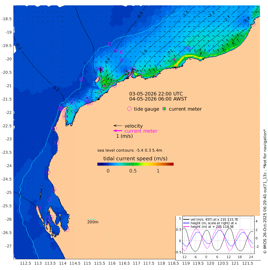 4cm/s 140T +12cm/s rms + 5cm/s -173T. NWSBAR 206m 1cm/s 30T +22cm/s rms + 10cm/s -148T. TAN100 109m 3cm/s -66T +11cm/s rms + 8cm/s -129T. PIL200 208m 4cm/s -91T +13cm/s rms + 7cm/s -137T. PIL100 105m 6cm/s -88T +12cm/s rms + 2cm/s -92T. PIL050 55m 1cm/s 58T +18cm/s rms + 4cm/s -149T. NRSNIN 61m 13cm/s -90T +6cm/s rms + 3cm/s 112T. NW Shelf M6 65m -2cm Withnell Point -2cm Denham -2cm Shark Bay (Inr Bn) -2cm Shark Bay -3cm Useless Loop -2cm Hamelin Pool -12cm Carnarvon -7cm Cape Cuvier -11cm Coral Bay -12cm Norwegian Bay -64cm Badjirrajirra -20cm Tantabiddi -41cm Point Murat -54cm Exmouth -68cm Learmonth -54cm Y Island -34cm North Muiron Island -47cm Roller -51cm Ashburton North -57cm Onslow (Beadon Creek) -53cm Thevenard Island -103cm Large Island -118cm North Sandy Island -85cm Barrow Island (Wapet Landing) -114cm Barrow Island (Tanker Mooring) -130cm Withnell Bay -73cm Trimouille Island -67cm North West Island -136cm Fortescue Road -120cm Steamboat Island -123cm Sholl Island -127cm Fairway Beacon -131cm Mawby Island -131cm Dampier (King Bay) -123cm Cape Legendre -146cm Hauy Island -170cm Port Walcott (Cape Lambert) -187cm Depuch Island -218cm Port Hedland -219cm Bedout Island -347cm Lagrange Bay