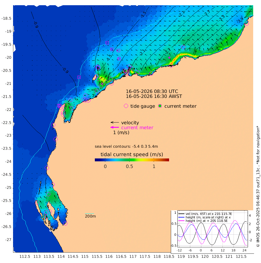 6cm/s 126T +12cm/s rms + 5cm/s -173T. NWSBAR 206m 7cm/s -140T +22cm/s rms + 10cm/s -148T. TAN100 109m 5cm/s -84T +11cm/s rms + 8cm/s -129T. PIL200 208m 10cm/s -76T +13cm/s rms + 7cm/s -137T. PIL100 105m 13cm/s -80T +12cm/s rms + 2cm/s -92T. PIL050 55m 6cm/s -139T +18cm/s rms + 4cm/s -149T. NRSNIN 61m 19cm/s -75T +6cm/s rms + 3cm/s 112T. NW Shelf M6 65m -49cm Withnell Point -24cm Denham -20cm Shark Bay (Inr Bn) -25cm Shark Bay -4cm Useless Loop 29cm Hamelin Pool -75cm Carnarvon -63cm Cape Cuvier -65cm Coral Bay -69cm Norwegian Bay -120cm Badjirrajirra -74cm Tantabiddi -96cm Point Murat -109cm Exmouth -123cm Learmonth -107cm Y Island -88cm North Muiron Island -104cm Roller -107cm Ashburton North -114cm Onslow (Beadon Creek) -110cm Thevenard Island -122cm Large Island -180cm North Sandy Island -143cm Barrow Island (Wapet Landing) -173cm Barrow Island (Tanker Mooring) -195cm Withnell Bay -141cm Trimouille Island -121cm North West Island -139cm Fortescue Road -194cm Steamboat Island -170cm Sholl Island -192cm Fairway Beacon -195cm Mawby Island -195cm Dampier (King Bay) -203cm Cape Legendre -208cm Hauy Island -235cm Port Walcott (Cape Lambert) -266cm Depuch Island -283cm Port Hedland -258cm Bedout Island -357cm Lagrange Bay