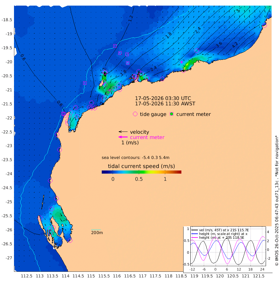 8cm/s -81T +12cm/s rms + 5cm/s -173T. NWSBAR 206m 1cm/s -127T +22cm/s rms + 10cm/s -148T. TAN100 109m 4cm/s -66T +11cm/s rms + 8cm/s -129T. PIL200 208m 9cm/s -24T +13cm/s rms + 7cm/s -137T. PIL100 105m 11cm/s -13T +12cm/s rms + 2cm/s -92T. PIL050 55m 2cm/s -120T +18cm/s rms + 4cm/s -149T. NRSNIN 61m 9cm/s 50T +6cm/s rms + 3cm/s 112T. NW Shelf M6 65m 53cm Withnell Point 56cm Denham 53cm Shark Bay (Inr Bn) 57cm Shark Bay 47cm Useless Loop -7cm Hamelin Pool 66cm Carnarvon 45cm Cape Cuvier 48cm Coral Bay 51cm Norwegian Bay 121cm Badjirrajirra 58cm Tantabiddi 90cm Point Murat 108cm Exmouth 118cm Learmonth 103cm Y Island 77cm North Muiron Island 92cm Roller 95cm Ashburton North 106cm Onslow (Beadon Creek) 99cm Thevenard Island 147cm Large Island 183cm North Sandy Island 139cm Barrow Island (Wapet Landing) 184cm Barrow Island (Tanker Mooring) 187cm Withnell Bay 132cm Trimouille Island 112cm North West Island 171cm Fortescue Road 187cm Steamboat Island 171cm Sholl Island 184cm Fairway Beacon 184cm Mawby Island 187cm Dampier (King Bay) 188cm Cape Legendre 206cm Hauy Island 232cm Port Walcott (Cape Lambert) 263cm Depuch Island 284cm Port Hedland 273cm Bedout Island 368cm Lagrange Bay