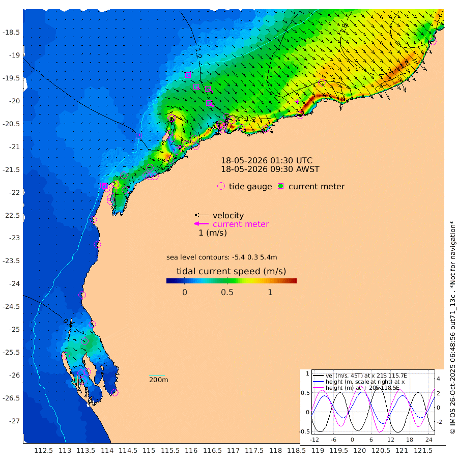 8cm/s 57T +12cm/s rms + 5cm/s -173T. NWSBAR 206m 12cm/s 41T +22cm/s rms + 10cm/s -148T. TAN100 109m 18cm/s 108T +11cm/s rms + 8cm/s -129T. PIL200 208m 32cm/s 123T +13cm/s rms + 7cm/s -137T. PIL100 105m 38cm/s 125T +12cm/s rms + 2cm/s -92T. PIL050 55m 12cm/s 46T +18cm/s rms + 4cm/s -149T. NRSNIN 61m 43cm/s 121T +6cm/s rms + 3cm/s 112T. NW Shelf M6 65m 47cm Withnell Point 30cm Denham 29cm Shark Bay (Inr Bn) 35cm Shark Bay 23cm Useless Loop -11cm Hamelin Pool 66cm Carnarvon 68cm Cape Cuvier 72cm Coral Bay 71cm Norwegian Bay 79cm Badjirrajirra 75cm Tantabiddi 75cm Point Murat 76cm Exmouth 76cm Learmonth 85cm Y Island 80cm North Muiron Island 88cm Roller 90cm Ashburton North 90cm Onslow (Beadon Creek) 93cm Thevenard Island 38cm Large Island 91cm North Sandy Island 100cm Barrow Island (Wapet Landing) 87cm Barrow Island (Tanker Mooring) 136cm Withnell Bay 90cm Trimouille Island 96cm North West Island 44cm Fortescue Road 131cm Steamboat Island 88cm Sholl Island 131cm Fairway Beacon 136cm Mawby Island 135cm Dampier (King Bay) 146cm Cape Legendre 121cm Hauy Island 146cm Port Walcott (Cape Lambert) 148cm Depuch Island 172cm Port Hedland 188cm Bedout Island 215cm Lagrange Bay
