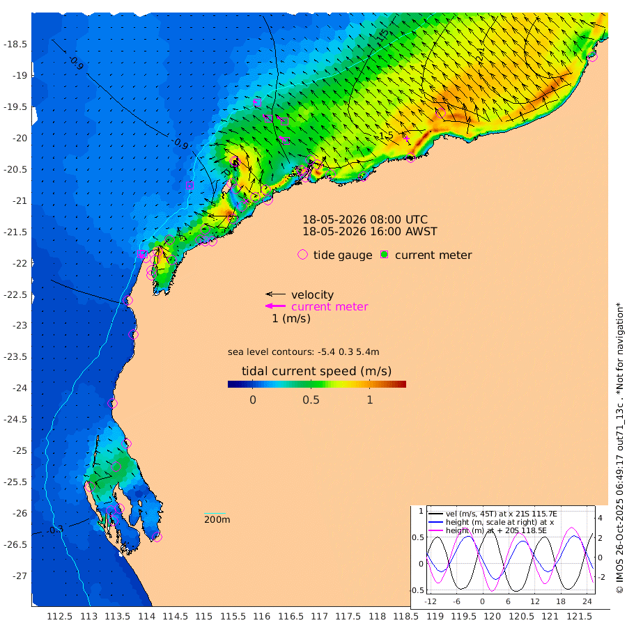 9cm/s -143T +12cm/s rms + 5cm/s -173T. NWSBAR 206m 15cm/s -138T +22cm/s rms + 10cm/s -148T. TAN100 109m 20cm/s -75T +11cm/s rms + 8cm/s -129T. PIL200 208m 35cm/s -57T +13cm/s rms + 7cm/s -137T. PIL100 105m 42cm/s -54T +12cm/s rms + 2cm/s -92T. PIL050 55m 15cm/s -134T +18cm/s rms + 4cm/s -149T. NRSNIN 61m 46cm/s -56T +6cm/s rms + 3cm/s 112T. NW Shelf M6 65m -19cm Withnell Point 20cm Denham 22cm Shark Bay (Inr Bn) 16cm Shark Bay 35cm Useless Loop 26cm Hamelin Pool -49cm Carnarvon -58cm Cape Cuvier -61cm Coral Bay -62cm Norwegian Bay -69cm Badjirrajirra -65cm Tantabiddi -64cm Point Murat -64cm Exmouth -72cm Learmonth -73cm Y Island -68cm North Muiron Island -79cm Roller -82cm Ashburton North -82cm Onslow (Beadon Creek) -85cm Thevenard Island -38cm Large Island -98cm North Sandy Island -96cm Barrow Island (Wapet Landing) -87cm Barrow Island (Tanker Mooring) -140cm Withnell Bay -93cm Trimouille Island -87cm North West Island -49cm Fortescue Road -130cm Steamboat Island -104cm Sholl Island -136cm Fairway Beacon -143cm Mawby Island -140cm Dampier (King Bay) -151cm Cape Legendre -131cm Hauy Island -157cm Port Walcott (Cape Lambert) -162cm Depuch Island -191cm Port Hedland -195cm Bedout Island -257cm Lagrange Bay