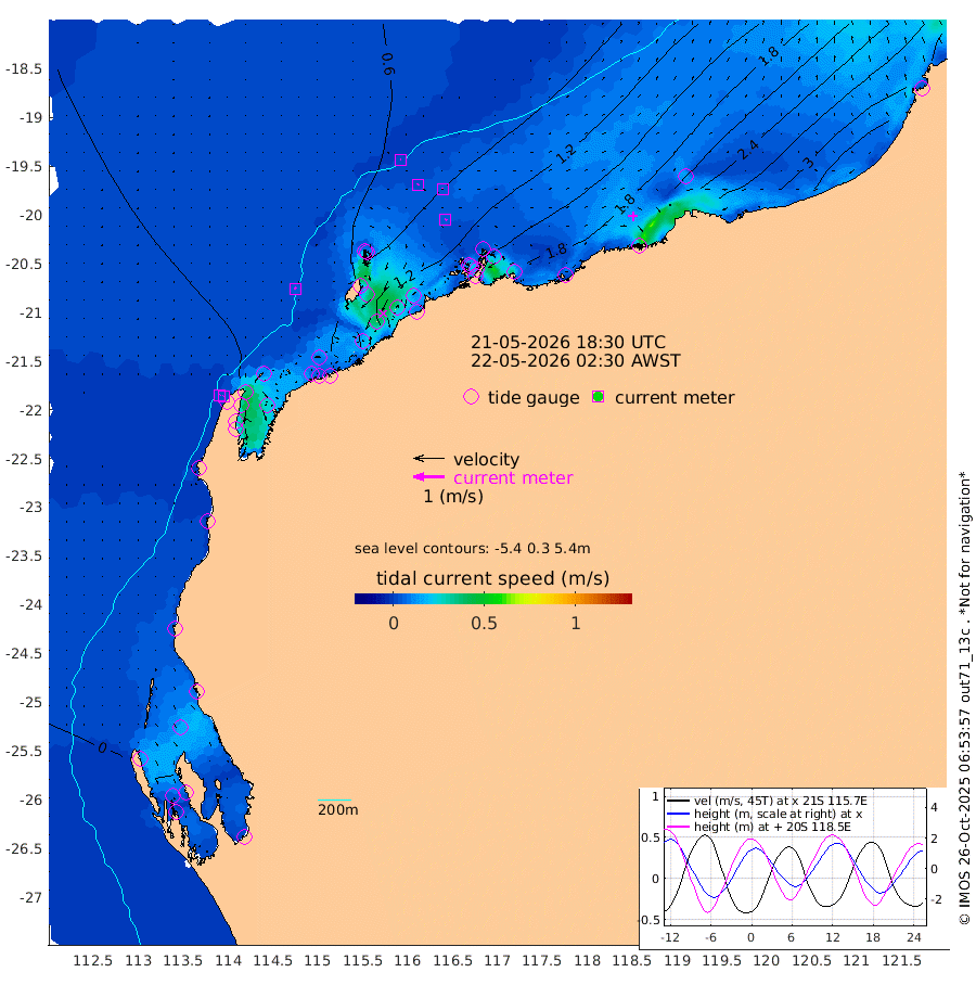 4cm/s -47T +12cm/s rms + 5cm/s -173T. NWSBAR 206m 2cm/s 52T +22cm/s rms + 10cm/s -148T. TAN100 109m 1cm/s 63T +11cm/s rms + 8cm/s -129T. PIL200 208m 3cm/s 24T +13cm/s rms + 7cm/s -137T. PIL100 105m 4cm/s 34T +12cm/s rms + 2cm/s -92T. PIL050 55m 2cm/s 44T +18cm/s rms + 4cm/s -149T. NRSNIN 61m 5cm/s -8T +6cm/s rms + 3cm/s 112T. NW Shelf M6 65m -3cm Withnell Point -22cm Denham -23cm Shark Bay (Inr Bn) -25cm Shark Bay -33cm Useless Loop -16cm Hamelin Pool 17cm Carnarvon 12cm Cape Cuvier 13cm Coral Bay 20cm Norwegian Bay 62cm Badjirrajirra 20cm Tantabiddi 40cm Point Murat 51cm Exmouth 64cm Learmonth 47cm Y Island 31cm North Muiron Island 38cm Roller 46cm Ashburton North 52cm Onslow (Beadon Creek) 47cm Thevenard Island 102cm Large Island 109cm North Sandy Island 76cm Barrow Island (Wapet Landing) 106cm Barrow Island (Tanker Mooring) 111cm Withnell Bay 83cm Trimouille Island 49cm North West Island 126cm Fortescue Road 107cm Steamboat Island 122cm Sholl Island 110cm Fairway Beacon 110cm Mawby Island 113cm Dampier (King Bay) 115cm Cape Legendre 128cm Hauy Island 145cm Port Walcott (Cape Lambert) 156cm Depuch Island 183cm Port Hedland 167cm Bedout Island 254cm Lagrange Bay