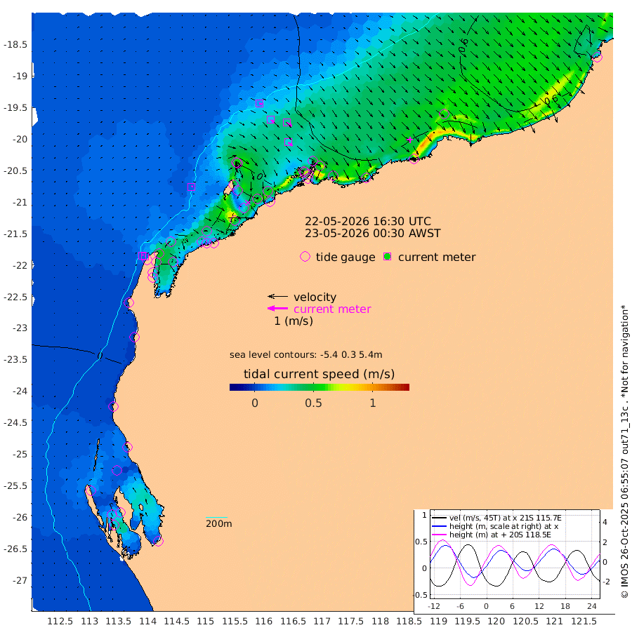 6cm/s 56T +12cm/s rms + 5cm/s -173T. NWSBAR 206m 6cm/s 43T +22cm/s rms + 10cm/s -148T. TAN100 109m 14cm/s 108T +11cm/s rms + 8cm/s -129T. PIL200 208m 22cm/s 126T +13cm/s rms + 7cm/s -137T. PIL100 105m 26cm/s 130T +12cm/s rms + 2cm/s -92T. PIL050 55m 6cm/s 51T +18cm/s rms + 4cm/s -149T. NRSNIN 61m 32cm/s 125T +6cm/s rms + 3cm/s 112T. NW Shelf M6 65m -27cm Withnell Point -40cm Denham -36cm Shark Bay (Inr Bn) -42cm Shark Bay -36cm Useless Loop 3cm Hamelin Pool -19cm Carnarvon -4cm Cape Cuvier -2cm Coral Bay -1cm Norwegian Bay -9cm Badjirrajirra -1cm Tantabiddi -8cm Point Murat -10cm Exmouth -3cm Learmonth -1cm Y Island 1cm North Muiron Island 4cm Roller 4cm Ashburton North 2cm Onslow (Beadon Creek) 3cm Thevenard Island 7cm Large Island -4cm North Sandy Island 4cm Barrow Island (Wapet Landing) -9cm Barrow Island (Tanker Mooring) 23cm Withnell Bay 10cm Trimouille Island 4cm North West Island 18cm Fortescue Road 17cm Steamboat Island 10cm Sholl Island 22cm Fairway Beacon 24cm Mawby Island 24cm Dampier (King Bay) 21cm Cape Legendre 17cm Hauy Island 28cm Port Walcott (Cape Lambert) 30cm Depuch Island 44cm Port Hedland 56cm Bedout Island 170cm Lagrange Bay