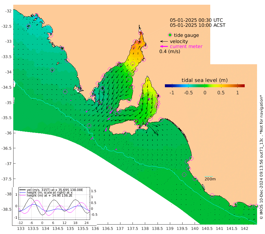 0cm/s -106T +10cm/s rms + 5cm/s 114T. SAM1DS 520m 8cm/s -134T +13cm/s rms + 5cm/s -36T. SAM2CP 100m 8cm/s -139T +21cm/s rms + 18cm/s 142T. SAM3MS 168m 7cm/s -109T +22cm/s rms + 0cm/s -30T. SAM4CY 117m 2cm/s 164T +23cm/s rms + 2cm/s 99T. SAM5CB 94m 17cm/s -126T +8cm/s rms + 3cm/s -172T. SAM6IS 83m 4cm/s -143T +11cm/s rms + 7cm/s 150T. SAM7DS 519m 22cm/s -139T +10cm/s rms + 2cm/s 87T. SAM8SG 47m 18cm/s -165T +20cm/s rms + 12cm/s -168T. NRSKAI 101m -9cm Warrnambool -9cm Port Fairy -10cm Portland -11cm Port Macdonnell -12cm Beachport -12cm Cape Rabelais (off) -13cm Robe -13cm Cape Jaffa -15cm Kingston -16cm Victor Harbor -19cm Vivonne Bay 10cm Kingscote 12cm American River -3cm Penneshaw 8cm Cape Jervis 19cm Second Valley 23cm Port Noarlunga 24cm Port Stanvac 28cm Brighton 24cm Glenelg 32cm Port Adelaide (Outer Harbor) 56cm Angus Inlet (Garden Island) 34cm Ardrossan 15cm Port Vincent 11cm Port Giles -16cm Stenhouse Bay -12cm Althorpe Island -11cm Pondalowie Bay -4cm Point Turton 0cm Port Victoria 4cm Cape Elizabeth 9cm Tiparra Reef Light 33cm Wallaroo 37cm Middle Bank 51cm Port Broughton 100cm Port Pirie 106cm Red Cliff Point (Beacon 5) 94cm Port Bonython 89cm Whyalla 74cm Western Shoal Beacon 24cm Franklin Harbor -2cm Franklin Harbor Entrance Beacon -12cm Arno Bay -20cm Port Neill -20cm Cape Hardy -24cm Tumby Bay -22cm Reevesby Island -28cm Port Lincoln -27cm Taylors Landing -10cm Whalers Bay -17cm Wedge Island Mooring -15cm Shelf Edge Mooring -25cm Coffin Bay Entrance Beacon -19cm Greenly Island -26cm Elliston -23cm Pearson Island -19cm Venus Bay -40cm Blanche Port (Streaky Bay) -41cm Thevenard -29cm St Francis Island