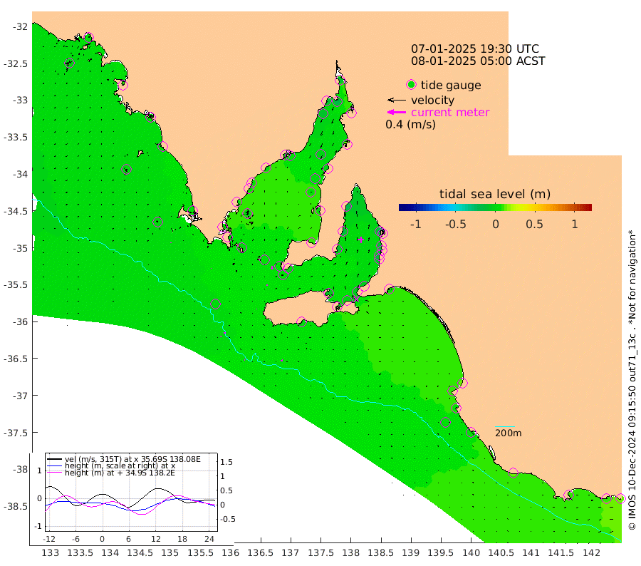 1cm/s -64T +10cm/s rms + 5cm/s 114T. SAM1DS 520m 1cm/s 145T +13cm/s rms + 5cm/s -36T. SAM2CP 100m 2cm/s -169T +21cm/s rms + 18cm/s 142T. SAM3MS 168m 4cm/s -95T +22cm/s rms + 0cm/s -30T. SAM4CY 117m 1cm/s 149T +23cm/s rms + 2cm/s 99T. SAM5CB 94m 2cm/s 142T +8cm/s rms + 3cm/s -172T. SAM6IS 83m 1cm/s -173T +11cm/s rms + 7cm/s 150T. SAM7DS 519m 6cm/s -179T +10cm/s rms + 2cm/s 87T. SAM8SG 47m 1cm/s -158T +20cm/s rms + 12cm/s -168T. NRSKAI 101m 12cm Warrnambool 11cm Port Fairy 8cm Portland 13cm Port Macdonnell 5cm Beachport 6cm Cape Rabelais (off) 7cm Robe 10cm Cape Jaffa 11cm Kingston 6cm Victor Harbor 2cm Vivonne Bay -7cm Kingscote -6cm American River -2cm Penneshaw -6cm Cape Jervis -6cm Second Valley -13cm Port Noarlunga -14cm Port Stanvac -16cm Brighton -15cm Glenelg -18cm Port Adelaide (Outer Harbor) -26cm Angus Inlet (Garden Island) -22cm Ardrossan -17cm Port Vincent -10cm Port Giles 4cm Stenhouse Bay 6cm Althorpe Island 4cm Pondalowie Bay 8cm Point Turton 3cm Port Victoria 6cm Cape Elizabeth 3cm Tiparra Reef Light 0cm Wallaroo -3cm Middle Bank 14cm Port Broughton -10cm Port Pirie -8cm Red Cliff Point (Beacon 5) -18cm Port Bonython -12cm Whyalla -9cm Western Shoal Beacon 6cm Franklin Harbor 4cm Franklin Harbor Entrance Beacon 2cm Arno Bay 6cm Port Neill 5cm Cape Hardy 6cm Tumby Bay 0cm Reevesby Island 4cm Port Lincoln 4cm Taylors Landing 4cm Whalers Bay 4cm Wedge Island Mooring 2cm Shelf Edge Mooring 5cm Coffin Bay Entrance Beacon 1cm Greenly Island 5cm Elliston 0cm Pearson Island 6cm Venus Bay 8cm Blanche Port (Streaky Bay) 5cm Thevenard 2cm St Francis Island