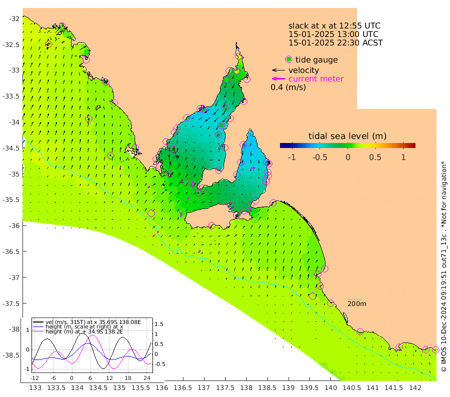 1cm/s 111T +10cm/s rms + 5cm/s 114T. SAM1DS 520m 6cm/s 38T +13cm/s rms + 5cm/s -36T. SAM2CP 100m 6cm/s 8T +21cm/s rms + 18cm/s 142T. SAM3MS 168m 10cm/s 35T +22cm/s rms + 0cm/s -30T. SAM4CY 117m 5cm/s 11T +23cm/s rms + 2cm/s 99T. SAM5CB 94m 7cm/s 32T +8cm/s rms + 3cm/s -172T. SAM6IS 83m 3cm/s -14T +11cm/s rms + 7cm/s 150T. SAM7DS 519m 18cm/s 16T +10cm/s rms + 2cm/s 87T. SAM8SG 47m 13cm/s 8T +20cm/s rms + 12cm/s -168T. NRSKAI 101m 20cm Warrnambool 17cm Port Fairy 19cm Portland 9cm Port Macdonnell 20cm Beachport 19cm Cape Rabelais (off) 16cm Robe 12cm Cape Jaffa 14cm Kingston 16cm Victor Harbor 24cm Vivonne Bay -26cm Kingscote -21cm American River -16cm Penneshaw -18cm Cape Jervis -30cm Second Valley -47cm Port Noarlunga -49cm Port Stanvac -49cm Brighton -53cm Glenelg -58cm Port Adelaide (Outer Harbor) -46cm Angus Inlet (Garden Island) -74cm Ardrossan -67cm Port Vincent -52cm Port Giles -6cm Stenhouse Bay -2cm Althorpe Island -4cm Pondalowie Bay -24cm Point Turton -28cm Port Victoria -25cm Cape Elizabeth -19cm Tiparra Reef Light -16cm Wallaroo -14cm Middle Bank -18cm Port Broughton 24cm Port Pirie 37cm Red Cliff Point (Beacon 5) 20cm Port Bonython 12cm Whyalla 7cm Western Shoal Beacon -30cm Franklin Harbor -24cm Franklin Harbor Entrance Beacon -21cm Arno Bay -19cm Port Neill -15cm Cape Hardy -11cm Tumby Bay -9cm Reevesby Island -5cm Port Lincoln 7cm Taylors Landing -16cm Whalers Bay 1cm Wedge Island Mooring 19cm Shelf Edge Mooring 14cm Coffin Bay Entrance Beacon 18cm Greenly Island 14cm Elliston 17cm Pearson Island 2cm Venus Bay 9cm Blanche Port (Streaky Bay) 13cm Thevenard 22cm St Francis Island