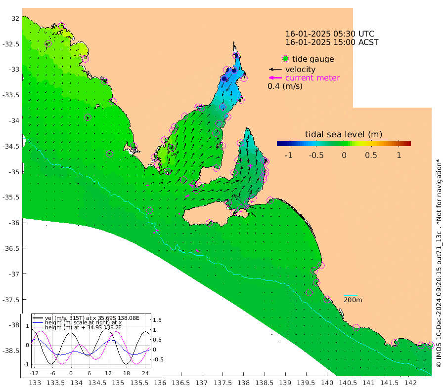 1cm/s 79T +10cm/s rms + 5cm/s 114T. SAM1DS 520m 7cm/s 72T +13cm/s rms + 5cm/s -36T. SAM2CP 100m 8cm/s 99T +21cm/s rms + 18cm/s 142T. SAM3MS 168m 9cm/s 138T +22cm/s rms + 0cm/s -30T. SAM4CY 117m 0cm/s -126T +23cm/s rms + 2cm/s 99T. SAM5CB 94m 13cm/s 65T +8cm/s rms + 3cm/s -172T. SAM6IS 83m 4cm/s 95T +11cm/s rms + 7cm/s 150T. SAM7DS 519m 14cm/s 108T +10cm/s rms + 2cm/s 87T. SAM8SG 47m 3cm/s 67T +20cm/s rms + 12cm/s -168T. NRSKAI 101m -19cm Warrnambool -17cm Port Fairy -16cm Portland -12cm Port Macdonnell -14cm Beachport -13cm Cape Rabelais (off) -11cm Robe -11cm Cape Jaffa -11cm Kingston -13cm Victor Harbor -9cm Vivonne Bay -22cm Kingscote -25cm American River -14cm Penneshaw -23cm Cape Jervis -33cm Second Valley -29cm Port Noarlunga -30cm Port Stanvac -32cm Brighton -30cm Glenelg -35cm Port Adelaide (Outer Harbor) -60cm Angus Inlet (Garden Island) -32cm Ardrossan -13cm Port Vincent -18cm Port Giles -1cm Stenhouse Bay -10cm Althorpe Island -5cm Pondalowie Bay -13cm Point Turton -10cm Port Victoria -21cm Cape Elizabeth -31cm Tiparra Reef Light -55cm Wallaroo -64cm Middle Bank -44cm Port Broughton -134cm Port Pirie -156cm Red Cliff Point (Beacon 5) -129cm Port Bonython -126cm Whyalla -111cm Western Shoal Beacon -45cm Franklin Harbor -29cm Franklin Harbor Entrance Beacon -15cm Arno Bay -9cm Port Neill -6cm Cape Hardy -2cm Tumby Bay -2cm Reevesby Island 4cm Port Lincoln 0cm Taylors Landing -6cm Whalers Bay -6cm Wedge Island Mooring -11cm Shelf Edge Mooring -1cm Coffin Bay Entrance Beacon -3cm Greenly Island 2cm Elliston 4cm Pearson Island 3cm Venus Bay 19cm Blanche Port (Streaky Bay) 18cm Thevenard 13cm St Francis Island