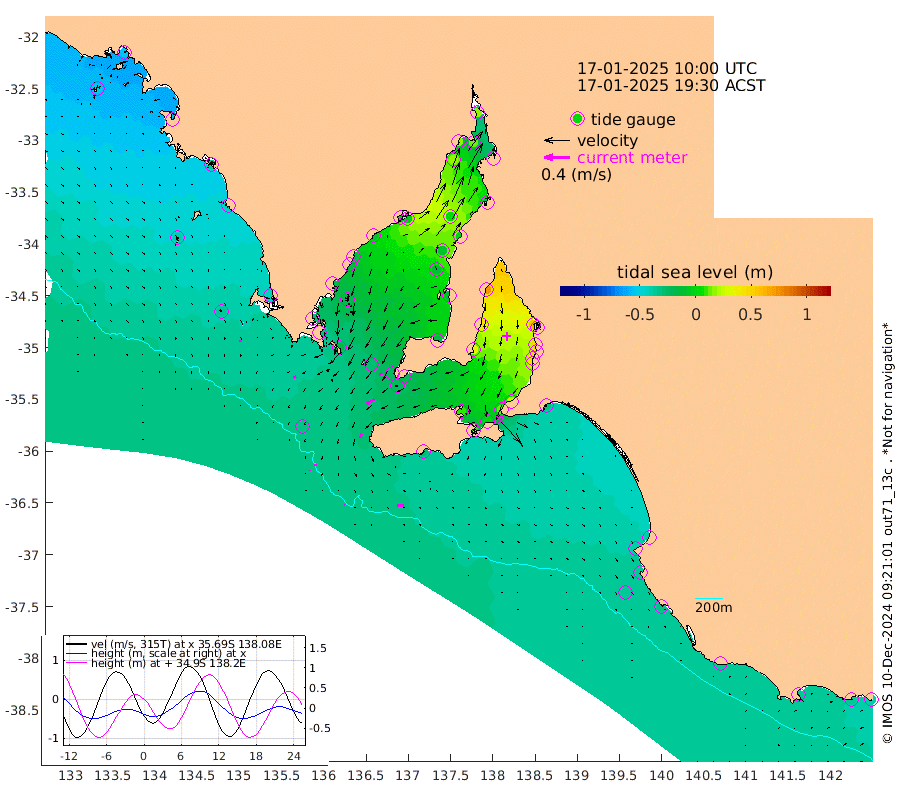 1cm/s 125T +10cm/s rms + 5cm/s 114T. SAM1DS 520m 4cm/s -117T +13cm/s rms + 5cm/s -36T. SAM2CP 100m 2cm/s -5T +21cm/s rms + 18cm/s 142T. SAM3MS 168m 9cm/s 89T +22cm/s rms + 0cm/s -30T. SAM4CY 117m 3cm/s 173T +23cm/s rms + 2cm/s 99T. SAM5CB 94m 14cm/s -121T +8cm/s rms + 3cm/s -172T. SAM6IS 83m 2cm/s -4T +11cm/s rms + 7cm/s 150T. SAM7DS 519m 5cm/s -116T +10cm/s rms + 2cm/s 87T. SAM8SG 47m 6cm/s -162T +20cm/s rms + 12cm/s -168T. NRSKAI 101m -38cm Warrnambool -37cm Port Fairy -36cm Portland -36cm Port Macdonnell -34cm Beachport -36cm Cape Rabelais (off) -35cm Robe -40cm Cape Jaffa -40cm Kingston -33cm Victor Harbor -30cm Vivonne Bay 9cm Kingscote 11cm American River 0cm Penneshaw 11cm Cape Jervis 25cm Second Valley 39cm Port Noarlunga 43cm Port Stanvac 44cm Brighton 45cm Glenelg 56cm Port Adelaide (Outer Harbor) 64cm Angus Inlet (Garden Island) 74cm Ardrossan 43cm Port Vincent 36cm Port Giles -22cm Stenhouse Bay -24cm Althorpe Island -25cm Pondalowie Bay -20cm Point Turton -16cm Port Victoria -14cm Cape Elizabeth -8cm Tiparra Reef Light -3cm Wallaroo 3cm Middle Bank -30cm Port Broughton 5cm Port Pirie 18cm Red Cliff Point (Beacon 5) 13cm Port Bonython 17cm Whyalla 18cm Western Shoal Beacon -1cm Franklin Harbor -4cm Franklin Harbor Entrance Beacon -9cm Arno Bay -19cm Port Neill -17cm Cape Hardy -22cm Tumby Bay -20cm Reevesby Island -28cm Port Lincoln -32cm Taylors Landing -18cm Whalers Bay -29cm Wedge Island Mooring -32cm Shelf Edge Mooring -42cm Coffin Bay Entrance Beacon -35cm Greenly Island -42cm Elliston -41cm Pearson Island -35cm Venus Bay -59cm Blanche Port (Streaky Bay) -56cm Thevenard -49cm St Francis Island