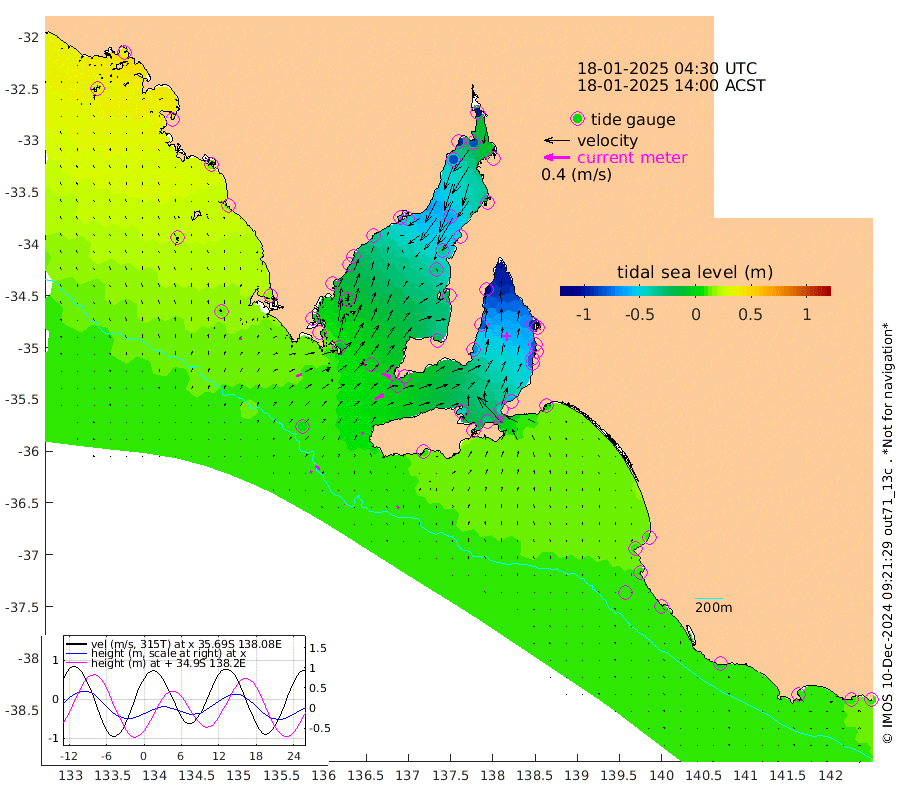 0cm/s 37T +10cm/s rms + 5cm/s 114T. SAM1DS 520m 9cm/s 69T +13cm/s rms + 5cm/s -36T. SAM2CP 100m 7cm/s 121T +21cm/s rms + 18cm/s 142T. SAM3MS 168m 5cm/s 149T +22cm/s rms + 0cm/s -30T. SAM4CY 117m 3cm/s 9T +23cm/s rms + 2cm/s 99T. SAM5CB 94m 16cm/s 63T +8cm/s rms + 3cm/s -172T. SAM6IS 83m 3cm/s 118T +11cm/s rms + 7cm/s 150T. SAM7DS 519m 14cm/s 114T +10cm/s rms + 2cm/s 87T. SAM8SG 47m 3cm/s 67T +20cm/s rms + 12cm/s -168T. NRSKAI 101m 8cm Warrnambool 9cm Port Fairy 9cm Portland 7cm Port Macdonnell 8cm Beachport 9cm Cape Rabelais (off) 10cm Robe 10cm Cape Jaffa 11cm Kingston 4cm Victor Harbor 10cm Vivonne Bay -45cm Kingscote -44cm American River -31cm Penneshaw -41cm Cape Jervis -62cm Second Valley -75cm Port Noarlunga -78cm Port Stanvac -81cm Brighton -81cm Glenelg -92cm Port Adelaide (Outer Harbor) -102cm Angus Inlet (Garden Island) -110cm Ardrossan -80cm Port Vincent -70cm Port Giles -3cm Stenhouse Bay -7cm Althorpe Island -1cm Pondalowie Bay -19cm Point Turton -19cm Port Victoria -31cm Cape Elizabeth -37cm Tiparra Reef Light -50cm Wallaroo -60cm Middle Bank -16cm Port Broughton -78cm Port Pirie -99cm Red Cliff Point (Beacon 5) -85cm Port Bonython -90cm Whyalla -85cm Western Shoal Beacon -50cm Franklin Harbor -44cm Franklin Harbor Entrance Beacon -31cm Arno Bay -25cm Port Neill -23cm Cape Hardy -16cm Tumby Bay -11cm Reevesby Island -1cm Port Lincoln 5cm Taylors Landing -13cm Whalers Bay -1cm Wedge Island Mooring 7cm Shelf Edge Mooring 15cm Coffin Bay Entrance Beacon 15cm Greenly Island 18cm Elliston 20cm Pearson Island 12cm Venus Bay 33cm Blanche Port (Streaky Bay) 34cm Thevenard 31cm St Francis Island