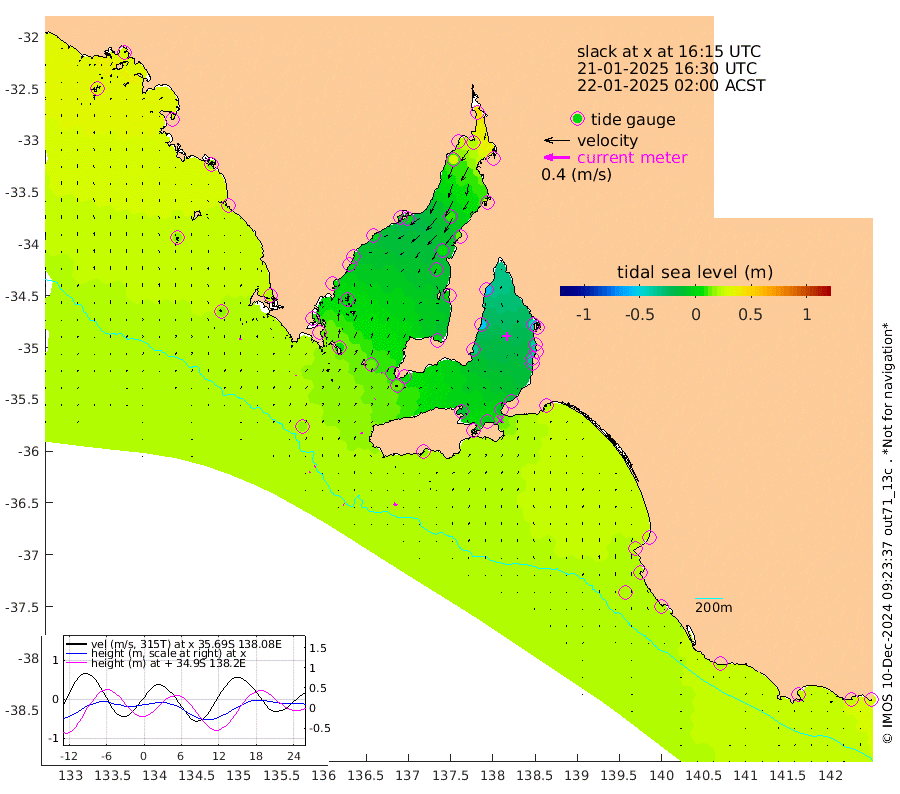 1cm/s -77T +10cm/s rms + 5cm/s 114T. SAM1DS 520m 1cm/s 38T +13cm/s rms + 5cm/s -36T. SAM2CP 100m 1cm/s -121T +21cm/s rms + 18cm/s 142T. SAM3MS 168m 6cm/s -54T +22cm/s rms + 0cm/s -30T. SAM4CY 117m 2cm/s 19T +23cm/s rms + 2cm/s 99T. SAM5CB 94m 1cm/s 69T +8cm/s rms + 3cm/s -172T. SAM6IS 83m 1cm/s -120T +11cm/s rms + 7cm/s 150T. SAM7DS 519m 2cm/s -40T +10cm/s rms + 2cm/s 87T. SAM8SG 47m 1cm/s -14T +20cm/s rms + 12cm/s -168T. NRSKAI 101m 26cm Warrnambool 24cm Port Fairy 24cm Portland 21cm Port Macdonnell 20cm Beachport 21cm Cape Rabelais (off) 21cm Robe 25cm Cape Jaffa 23cm Kingston 20cm Victor Harbor 18cm Vivonne Bay -14cm Kingscote -11cm American River -7cm Penneshaw -9cm Cape Jervis -18cm Second Valley -33cm Port Noarlunga -36cm Port Stanvac -37cm Brighton -38cm Glenelg -45cm Port Adelaide (Outer Harbor) -41cm Angus Inlet (Garden Island) -59cm Ardrossan -55cm Port Vincent -36cm Port Giles 5cm Stenhouse Bay 11cm Althorpe Island 8cm Pondalowie Bay 3cm Point Turton 0cm Port Victoria -1cm Cape Elizabeth 7cm Tiparra Reef Light 12cm Wallaroo 9cm Middle Bank 28cm Port Broughton 39cm Port Pirie 42cm Red Cliff Point (Beacon 5) 19cm Port Bonython 25cm Whyalla 27cm Western Shoal Beacon 2cm Franklin Harbor 0cm Franklin Harbor Entrance Beacon -1cm Arno Bay -2cm Port Neill 3cm Cape Hardy 6cm Tumby Bay 6cm Reevesby Island 8cm Port Lincoln 12cm Taylors Landing 6cm Whalers Bay 12cm Wedge Island Mooring 18cm Shelf Edge Mooring 21cm Coffin Bay Entrance Beacon 19cm Greenly Island 24cm Elliston 17cm Pearson Island 17cm Venus Bay 27cm Blanche Port (Streaky Bay) 28cm Thevenard 28cm St Francis Island