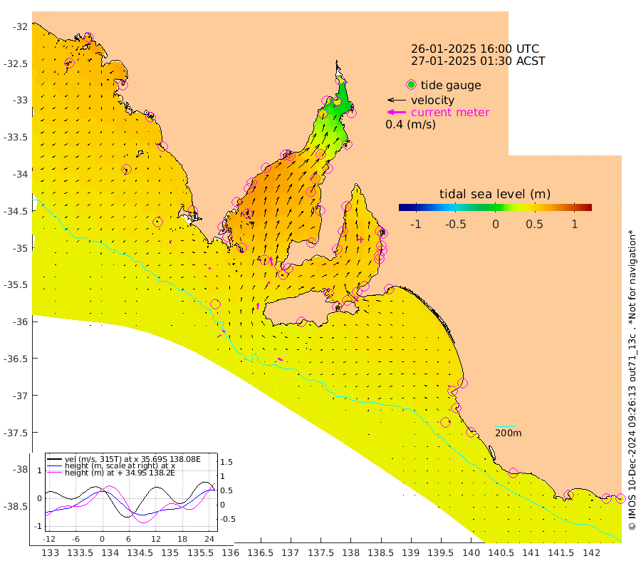 1cm/s -84T +10cm/s rms + 5cm/s 114T. SAM1DS 520m 4cm/s -89T +13cm/s rms + 5cm/s -36T. SAM2CP 100m 6cm/s -48T +21cm/s rms + 18cm/s 142T. SAM3MS 168m 11cm/s -65T +22cm/s rms + 0cm/s -30T. SAM4CY 117m 3cm/s -105T +23cm/s rms + 2cm/s 99T. SAM5CB 94m 8cm/s 46T +8cm/s rms + 3cm/s -172T. SAM6IS 83m 2cm/s -51T +11cm/s rms + 7cm/s 150T. SAM7DS 519m 20cm/s -10T +10cm/s rms + 2cm/s 87T. SAM8SG 47m 13cm/s 6T +20cm/s rms + 12cm/s -168T. NRSKAI 101m 38cm Warrnambool 38cm Port Fairy 39cm Portland 40cm Port Macdonnell 37cm Beachport 40cm Cape Rabelais (off) 39cm Robe 44cm Cape Jaffa 43cm Kingston 46cm Victor Harbor 35cm Vivonne Bay 56cm Kingscote 51cm American River 53cm Penneshaw 48cm Cape Jervis 49cm Second Valley 55cm Port Noarlunga 55cm Port Stanvac 54cm Brighton 56cm Glenelg 55cm Port Adelaide (Outer Harbor) 40cm Angus Inlet (Garden Island) 61cm Ardrossan 74cm Port Vincent 59cm Port Giles 48cm Stenhouse Bay 52cm Althorpe Island 45cm Pondalowie Bay 63cm Point Turton 60cm Port Victoria 64cm Cape Elizabeth 65cm Tiparra Reef Light 61cm Wallaroo 63cm Middle Bank 26cm Port Broughton 35cm Port Pirie 31cm Red Cliff Point (Beacon 5) 41cm Port Bonython 45cm Whyalla 49cm Western Shoal Beacon 62cm Franklin Harbor 75cm Franklin Harbor Entrance Beacon 72cm Arno Bay 80cm Port Neill 74cm Cape Hardy 71cm Tumby Bay 70cm Reevesby Island 64cm Port Lincoln 54cm Taylors Landing 58cm Whalers Bay 53cm Wedge Island Mooring 40cm Shelf Edge Mooring 52cm Coffin Bay Entrance Beacon 40cm Greenly Island 48cm Elliston 45cm Pearson Island 46cm Venus Bay 66cm Blanche Port (Streaky Bay) 62cm Thevenard 55cm St Francis Island
