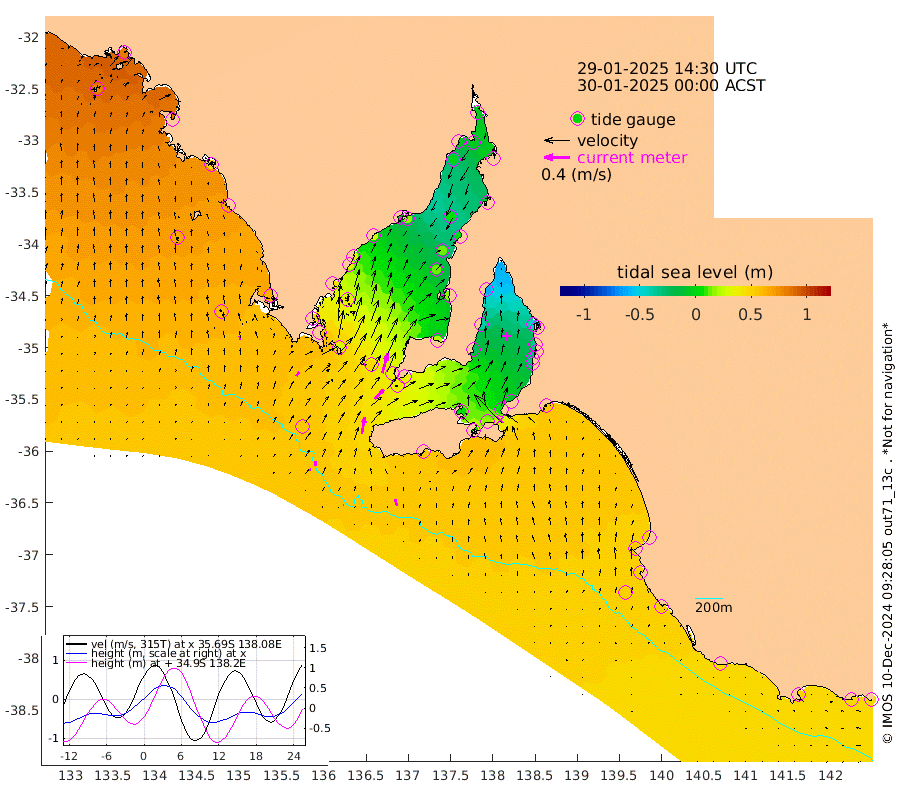 1cm/s -49T +10cm/s rms + 5cm/s 114T. SAM1DS 520m 8cm/s 34T +13cm/s rms + 5cm/s -36T. SAM2CP 100m 7cm/s 3T +21cm/s rms + 18cm/s 142T. SAM3MS 168m 10cm/s -16T +22cm/s rms + 0cm/s -30T. SAM4CY 117m 6cm/s -9T +23cm/s rms + 2cm/s 99T. SAM5CB 94m 20cm/s 44T +8cm/s rms + 3cm/s -172T. SAM6IS 83m 4cm/s -14T +11cm/s rms + 7cm/s 150T. SAM7DS 519m 32cm/s 16T +10cm/s rms + 2cm/s 87T. SAM8SG 47m 25cm/s 11T +20cm/s rms + 12cm/s -168T. NRSKAI 101m 47cm Warrnambool 45cm Port Fairy 49cm Portland 44cm Port Macdonnell 50cm Beachport 52cm Cape Rabelais (off) 50cm Robe 53cm Cape Jaffa 51cm Kingston 53cm Victor Harbor 54cm Vivonne Bay 2cm Kingscote 3cm American River 16cm Penneshaw 5cm Cape Jervis -13cm Second Valley -31cm Port Noarlunga -33cm Port Stanvac -33cm Brighton -35cm Glenelg -47cm Port Adelaide (Outer Harbor) -56cm Angus Inlet (Garden Island) -63cm Ardrossan -38cm Port Vincent -26cm Port Giles 34cm Stenhouse Bay 39cm Althorpe Island 34cm Pondalowie Bay 19cm Point Turton 16cm Port Victoria 14cm Cape Elizabeth 15cm Tiparra Reef Light 6cm Wallaroo 5cm Middle Bank -1cm Port Broughton 1cm Port Pirie -4cm Red Cliff Point (Beacon 5) -6cm Port Bonython -6cm Whyalla -3cm Western Shoal Beacon -8cm Franklin Harbor 17cm Franklin Harbor Entrance Beacon 27cm Arno Bay 34cm Port Neill 38cm Cape Hardy 45cm Tumby Bay 41cm Reevesby Island 49cm Port Lincoln 54cm Taylors Landing 30cm Whalers Bay 46cm Wedge Island Mooring 54cm Shelf Edge Mooring 62cm Coffin Bay Entrance Beacon 57cm Greenly Island 66cm Elliston 65cm Pearson Island 46cm Venus Bay 80cm Blanche Port (Streaky Bay) 81cm Thevenard 76cm St Francis Island
