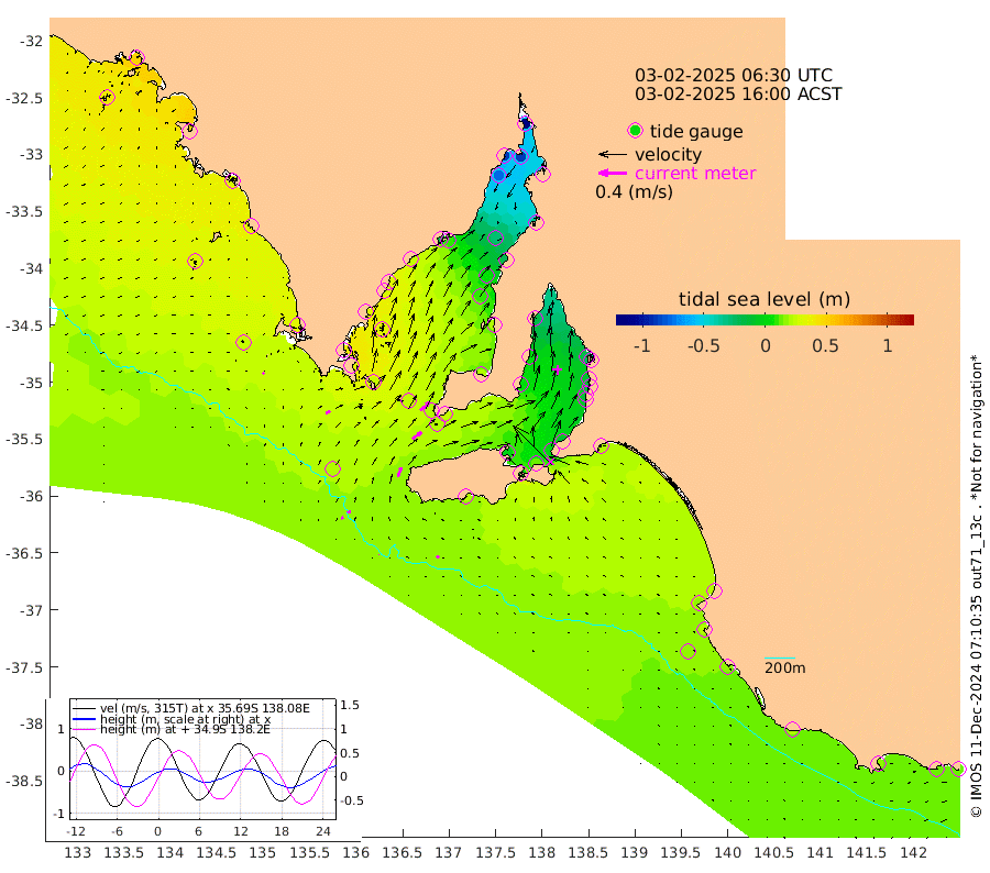 0cm/s 39T +10cm/s rms + 5cm/s 114T. SAM1DS 520m 7cm/s 55T +13cm/s rms + 5cm/s -36T. SAM2CP 100m 5cm/s 73T +21cm/s rms + 18cm/s 142T. SAM3MS 168m 3cm/s 132T +22cm/s rms + 0cm/s -30T. SAM4CY 117m 2cm/s -52T +23cm/s rms + 2cm/s 99T. SAM5CB 94m 16cm/s 55T +8cm/s rms + 3cm/s -172T. SAM6IS 83m 3cm/s 72T +11cm/s rms + 7cm/s 150T. SAM7DS 519m 17cm/s 47T +10cm/s rms + 2cm/s 87T. SAM8SG 47m 14cm/s 20T +20cm/s rms + 12cm/s -168T. NRSKAI 101m 14cm Warrnambool 14cm Port Fairy 15cm Portland 19cm Port Macdonnell 16cm Beachport 18cm Cape Rabelais (off) 19cm Robe 19cm Cape Jaffa 20cm Kingston 19cm Victor Harbor 20cm Vivonne Bay -1cm Kingscote -3cm American River 12cm Penneshaw -2cm Cape Jervis -13cm Second Valley -12cm Port Noarlunga -12cm Port Stanvac -17cm Brighton -12cm Glenelg -19cm Port Adelaide (Outer Harbor) -44cm Angus Inlet (Garden Island) -18cm Ardrossan 1cm Port Vincent 2cm Port Giles 26cm Stenhouse Bay 20cm Althorpe Island 22cm Pondalowie Bay 20cm Point Turton 19cm Port Victoria 9cm Cape Elizabeth 5cm Tiparra Reef Light -21cm Wallaroo -28cm Middle Bank -32cm Port Broughton -100cm Port Pirie -124cm Red Cliff Point (Beacon 5) -88cm Port Bonython -88cm Whyalla -76cm Western Shoal Beacon -17cm Franklin Harbor 9cm Franklin Harbor Entrance Beacon 23cm Arno Bay 33cm Port Neill 30cm Cape Hardy 33cm Tumby Bay 33cm Reevesby Island 39cm Port Lincoln 33cm Taylors Landing 23cm Whalers Bay 25cm Wedge Island Mooring 19cm Shelf Edge Mooring 30cm Coffin Bay Entrance Beacon 24cm Greenly Island 31cm Elliston 32cm Pearson Island 27cm Venus Bay 50cm Blanche Port (Streaky Bay) 50cm Thevenard 39cm St Francis Island