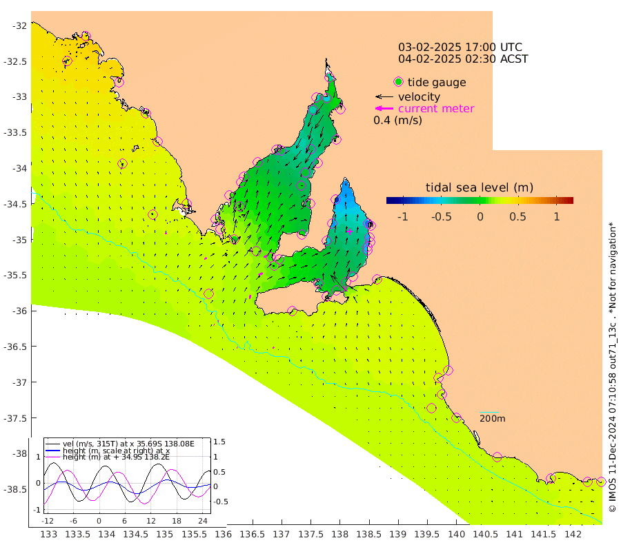 1cm/s -57T +10cm/s rms + 5cm/s 114T. SAM1DS 520m 6cm/s 59T +13cm/s rms + 5cm/s -36T. SAM2CP 100m 2cm/s 87T +21cm/s rms + 18cm/s 142T. SAM3MS 168m 3cm/s -43T +22cm/s rms + 0cm/s -30T. SAM4CY 117m 3cm/s 12T +23cm/s rms + 2cm/s 99T. SAM5CB 94m 10cm/s 66T +8cm/s rms + 3cm/s -172T. SAM6IS 83m 1cm/s 112T +11cm/s rms + 7cm/s 150T. SAM7DS 519m 8cm/s 65T +10cm/s rms + 2cm/s 87T. SAM8SG 47m 8cm/s 15T +20cm/s rms + 12cm/s -168T. NRSKAI 101m 27cm Warrnambool 26cm Port Fairy 25cm Portland 25cm Port Macdonnell 22cm Beachport 24cm Cape Rabelais (off) 24cm Robe 28cm Cape Jaffa 29cm Kingston 22cm Victor Harbor 22cm Vivonne Bay -28cm Kingscote -25cm American River -13cm Penneshaw -23cm Cape Jervis -38cm Second Valley -56cm Port Noarlunga -59cm Port Stanvac -63cm Brighton -63cm Glenelg -73cm Port Adelaide (Outer Harbor) -86cm Angus Inlet (Garden Island) -90cm Ardrossan -65cm Port Vincent -51cm Port Giles 8cm Stenhouse Bay 11cm Althorpe Island 10cm Pondalowie Bay 1cm Point Turton -4cm Port Victoria -5cm Cape Elizabeth -9cm Tiparra Reef Light -19cm Wallaroo -26cm Middle Bank 2cm Port Broughton -37cm Port Pirie -40cm Red Cliff Point (Beacon 5) -50cm Port Bonython -46cm Whyalla -39cm Western Shoal Beacon -20cm Franklin Harbor -11cm Franklin Harbor Entrance Beacon -5cm Arno Bay 2cm Port Neill 6cm Cape Hardy 11cm Tumby Bay 8cm Reevesby Island 16cm Port Lincoln 20cm Taylors Landing 4cm Whalers Bay 15cm Wedge Island Mooring 20cm Shelf Edge Mooring 29cm Coffin Bay Entrance Beacon 24cm Greenly Island 31cm Elliston 26cm Pearson Island 24cm Venus Bay 44cm Blanche Port (Streaky Bay) 43cm Thevenard 38cm St Francis Island