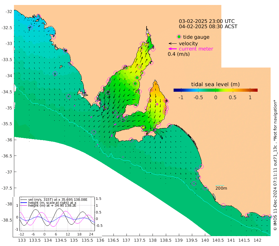 0cm/s 134T +10cm/s rms + 5cm/s 114T. SAM1DS 520m 7cm/s -125T +13cm/s rms + 5cm/s -36T. SAM2CP 100m 3cm/s -116T +21cm/s rms + 18cm/s 142T. SAM3MS 168m 3cm/s -153T +22cm/s rms + 0cm/s -30T. SAM4CY 117m 3cm/s 178T +23cm/s rms + 2cm/s 99T. SAM5CB 94m 11cm/s -123T +8cm/s rms + 3cm/s -172T. SAM6IS 83m 1cm/s -135T +11cm/s rms + 7cm/s 150T. SAM7DS 519m 13cm/s -139T +10cm/s rms + 2cm/s 87T. SAM8SG 47m 11cm/s -164T +20cm/s rms + 12cm/s -168T. NRSKAI 101m -32cm Warrnambool -30cm Port Fairy -31cm Portland -27cm Port Macdonnell -28cm Beachport -29cm Cape Rabelais (off) -30cm Robe -29cm Cape Jaffa -31cm Kingston -28cm Victor Harbor -30cm Vivonne Bay 23cm Kingscote 19cm American River 6cm Penneshaw 16cm Cape Jervis 36cm Second Valley 50cm Port Noarlunga 52cm Port Stanvac 57cm Brighton 56cm Glenelg 66cm Port Adelaide (Outer Harbor) 76cm Angus Inlet (Garden Island) 80cm Ardrossan 59cm Port Vincent 45cm Port Giles -15cm Stenhouse Bay -15cm Althorpe Island -15cm Pondalowie Bay -4cm Point Turton 1cm Port Victoria 6cm Cape Elizabeth 0cm Tiparra Reef Light 14cm Wallaroo 20cm Middle Bank 7cm Port Broughton 31cm Port Pirie 41cm Red Cliff Point (Beacon 5) 38cm Port Bonython 39cm Whyalla 32cm Western Shoal Beacon 22cm Franklin Harbor 8cm Franklin Harbor Entrance Beacon -1cm Arno Bay -8cm Port Neill -11cm Cape Hardy -15cm Tumby Bay -20cm Reevesby Island -24cm Port Lincoln -27cm Taylors Landing -9cm Whalers Bay -21cm Wedge Island Mooring -26cm Shelf Edge Mooring -35cm Coffin Bay Entrance Beacon -30cm Greenly Island -35cm Elliston -34cm Pearson Island -28cm Venus Bay -50cm Blanche Port (Streaky Bay) -50cm Thevenard -50cm St Francis Island