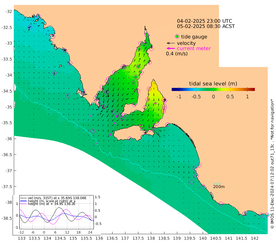 0cm/s 111T +10cm/s rms + 5cm/s 114T. SAM1DS 520m 4cm/s -130T +13cm/s rms + 5cm/s -36T. SAM2CP 100m 2cm/s -169T +21cm/s rms + 18cm/s 142T. SAM3MS 168m 4cm/s 164T +22cm/s rms + 0cm/s -30T. SAM4CY 117m 3cm/s 173T +23cm/s rms + 2cm/s 99T. SAM5CB 94m 8cm/s -129T +8cm/s rms + 3cm/s -172T. SAM6IS 83m 1cm/s 174T +11cm/s rms + 7cm/s 150T. SAM7DS 519m 14cm/s -159T +10cm/s rms + 2cm/s 87T. SAM8SG 47m 11cm/s -167T +20cm/s rms + 12cm/s -168T. NRSKAI 101m -39cm Warrnambool -36cm Port Fairy -37cm Portland -33cm Port Macdonnell -33cm Beachport -34cm Cape Rabelais (off) -35cm Robe -34cm Cape Jaffa -35cm Kingston -33cm Victor Harbor -33cm Vivonne Bay 11cm Kingscote 8cm American River -4cm Penneshaw 5cm Cape Jervis 21cm Second Valley 33cm Port Noarlunga 35cm Port Stanvac 40cm Brighton 39cm Glenelg 47cm Port Adelaide (Outer Harbor) 52cm Angus Inlet (Garden Island) 59cm Ardrossan 45cm Port Vincent 30cm Port Giles -19cm Stenhouse Bay -21cm Althorpe Island -19cm Pondalowie Bay -13cm Point Turton -10cm Port Victoria -5cm Cape Elizabeth -14cm Tiparra Reef Light -6cm Wallaroo -2cm Middle Bank -3cm Port Broughton -2cm Port Pirie 6cm Red Cliff Point (Beacon 5) 5cm Port Bonython 5cm Whyalla 1cm Western Shoal Beacon 5cm Franklin Harbor -7cm Franklin Harbor Entrance Beacon -12cm Arno Bay -17cm Port Neill -20cm Cape Hardy -22cm Tumby Bay -27cm Reevesby Island -29cm Port Lincoln -30cm Taylors Landing -17cm Whalers Bay -25cm Wedge Island Mooring -30cm Shelf Edge Mooring -37cm Coffin Bay Entrance Beacon -33cm Greenly Island -36cm Elliston -35cm Pearson Island -29cm Venus Bay -48cm Blanche Port (Streaky Bay) -48cm Thevenard -53cm St Francis Island