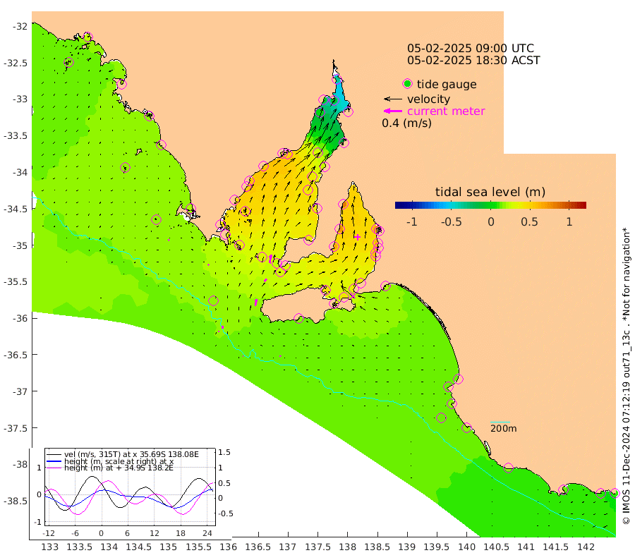0cm/s 76T +10cm/s rms + 5cm/s 114T. SAM1DS 520m 2cm/s -44T +13cm/s rms + 5cm/s -36T. SAM2CP 100m 6cm/s -6T +21cm/s rms + 18cm/s 142T. SAM3MS 168m 3cm/s 8T +22cm/s rms + 0cm/s -30T. SAM4CY 117m 2cm/s -109T +23cm/s rms + 2cm/s 99T. SAM5CB 94m 7cm/s 39T +8cm/s rms + 3cm/s -172T. SAM6IS 83m 3cm/s 6T +11cm/s rms + 7cm/s 150T. SAM7DS 519m 19cm/s 9T +10cm/s rms + 2cm/s 87T. SAM8SG 47m 15cm/s 11T +20cm/s rms + 12cm/s -168T. NRSKAI 101m 11cm Warrnambool 11cm Port Fairy 13cm Portland 16cm Port Macdonnell 15cm Beachport 15cm Cape Rabelais (off) 16cm Robe 15cm Cape Jaffa 14cm Kingston 20cm Victor Harbor 17cm Vivonne Bay 43cm Kingscote 39cm American River 43cm Penneshaw 38cm Cape Jervis 44cm Second Valley 55cm Port Noarlunga 59cm Port Stanvac 58cm Brighton 61cm Glenelg 64cm Port Adelaide (Outer Harbor) 48cm Angus Inlet (Garden Island) 79cm Ardrossan 74cm Port Vincent 67cm Port Giles 33cm Stenhouse Bay 30cm Althorpe Island 26cm Pondalowie Bay 39cm Point Turton 39cm Port Victoria 38cm Cape Elizabeth 38cm Tiparra Reef Light 25cm Wallaroo 29cm Middle Bank -22cm Port Broughton -26cm Port Pirie -35cm Red Cliff Point (Beacon 5) -10cm Port Bonython -5cm Whyalla 1cm Western Shoal Beacon 31cm Franklin Harbor 51cm Franklin Harbor Entrance Beacon 53cm Arno Bay 56cm Port Neill 50cm Cape Hardy 47cm Tumby Bay 45cm Reevesby Island 44cm Port Lincoln 33cm Taylors Landing 38cm Whalers Bay 31cm Wedge Island Mooring 18cm Shelf Edge Mooring 21cm Coffin Bay Entrance Beacon 17cm Greenly Island 20cm Elliston 18cm Pearson Island 18cm Venus Bay 24cm Blanche Port (Streaky Bay) 23cm Thevenard 16cm St Francis Island