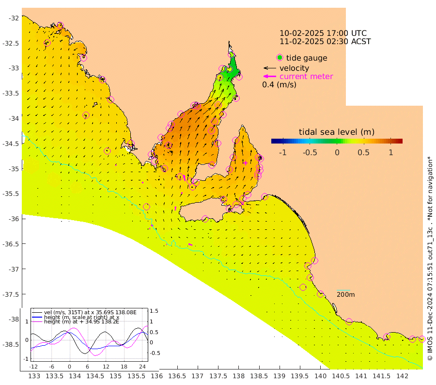 2cm/s -74T +10cm/s rms + 5cm/s 114T. SAM1DS 520m 5cm/s -99T +13cm/s rms + 5cm/s -36T. SAM2CP 100m 6cm/s -64T +21cm/s rms + 18cm/s 142T. SAM3MS 168m 12cm/s -71T +22cm/s rms + 0cm/s -30T. SAM4CY 117m 3cm/s -126T +23cm/s rms + 2cm/s 99T. SAM5CB 94m 4cm/s 35T +8cm/s rms + 3cm/s -172T. SAM6IS 83m 2cm/s -70T +11cm/s rms + 7cm/s 150T. SAM7DS 519m 19cm/s -12T +10cm/s rms + 2cm/s 87T. SAM8SG 47m 12cm/s 6T +20cm/s rms + 12cm/s -168T. NRSKAI 101m 35cm Warrnambool 35cm Port Fairy 35cm Portland 41cm Port Macdonnell 34cm Beachport 37cm Cape Rabelais (off) 37cm Robe 45cm Cape Jaffa 41cm Kingston 43cm Victor Harbor 31cm Vivonne Bay 58cm Kingscote 53cm American River 55cm Penneshaw 50cm Cape Jervis 54cm Second Valley 61cm Port Noarlunga 62cm Port Stanvac 60cm Brighton 64cm Glenelg 64cm Port Adelaide (Outer Harbor) 47cm Angus Inlet (Garden Island) 71cm Ardrossan 78cm Port Vincent 68cm Port Giles 50cm Stenhouse Bay 52cm Althorpe Island 47cm Pondalowie Bay 68cm Point Turton 70cm Port Victoria 72cm Cape Elizabeth 69cm Tiparra Reef Light 64cm Wallaroo 67cm Middle Bank 28cm Port Broughton 27cm Port Pirie 21cm Red Cliff Point (Beacon 5) 31cm Port Bonython 41cm Whyalla 47cm Western Shoal Beacon 69cm Franklin Harbor 83cm Franklin Harbor Entrance Beacon 80cm Arno Bay 83cm Port Neill 78cm Cape Hardy 75cm Tumby Bay 72cm Reevesby Island 67cm Port Lincoln 55cm Taylors Landing 63cm Whalers Bay 55cm Wedge Island Mooring 38cm Shelf Edge Mooring 50cm Coffin Bay Entrance Beacon 38cm Greenly Island 49cm Elliston 42cm Pearson Island 46cm Venus Bay 66cm Blanche Port (Streaky Bay) 61cm Thevenard 45cm St Francis Island