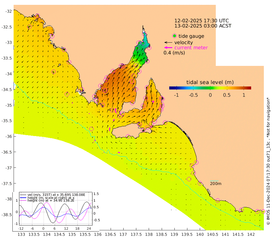 1cm/s -62T +10cm/s rms + 5cm/s 114T. SAM1DS 520m 3cm/s -72T +13cm/s rms + 5cm/s -36T. SAM2CP 100m 6cm/s -32T +21cm/s rms + 18cm/s 142T. SAM3MS 168m 10cm/s -71T +22cm/s rms + 0cm/s -30T. SAM4CY 117m 3cm/s -130T +23cm/s rms + 2cm/s 99T. SAM5CB 94m 9cm/s 44T +8cm/s rms + 3cm/s -172T. SAM6IS 83m 2cm/s -24T +11cm/s rms + 7cm/s 150T. SAM7DS 519m 23cm/s 3T +10cm/s rms + 2cm/s 87T. SAM8SG 47m 18cm/s 9T +20cm/s rms + 12cm/s -168T. NRSKAI 101m 30cm Warrnambool 31cm Port Fairy 31cm Portland 39cm Port Macdonnell 32cm Beachport 34cm Cape Rabelais (off) 35cm Robe 42cm Cape Jaffa 40cm Kingston 42cm Victor Harbor 30cm Vivonne Bay 59cm Kingscote 51cm American River 58cm Penneshaw 48cm Cape Jervis 52cm Second Valley 62cm Port Noarlunga 63cm Port Stanvac 61cm Brighton 66cm Glenelg 65cm Port Adelaide (Outer Harbor) 36cm Angus Inlet (Garden Island) 76cm Ardrossan 91cm Port Vincent 75cm Port Giles 53cm Stenhouse Bay 52cm Althorpe Island 48cm Pondalowie Bay 70cm Point Turton 70cm Port Victoria 73cm Cape Elizabeth 62cm Tiparra Reef Light 47cm Wallaroo 48cm Middle Bank 3cm Port Broughton -27cm Port Pirie -36cm Red Cliff Point (Beacon 5) -14cm Port Bonython -4cm Whyalla 5cm Western Shoal Beacon 60cm Franklin Harbor 83cm Franklin Harbor Entrance Beacon 84cm Arno Bay 91cm Port Neill 85cm Cape Hardy 83cm Tumby Bay 76cm Reevesby Island 74cm Port Lincoln 60cm Taylors Landing 64cm Whalers Bay 57cm Wedge Island Mooring 36cm Shelf Edge Mooring 51cm Coffin Bay Entrance Beacon 38cm Greenly Island 49cm Elliston 43cm Pearson Island 46cm Venus Bay 70cm Blanche Port (Streaky Bay) 65cm Thevenard 44cm St Francis Island