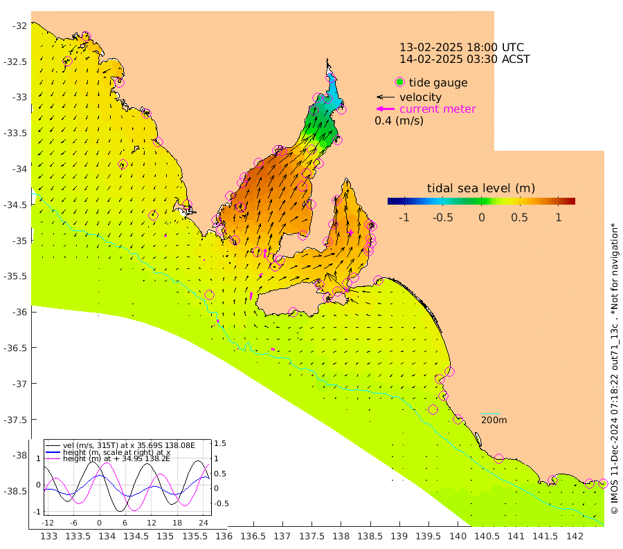 1cm/s -61T +10cm/s rms + 5cm/s 114T. SAM1DS 520m 3cm/s -77T +13cm/s rms + 5cm/s -36T. SAM2CP 100m 6cm/s -23T +21cm/s rms + 18cm/s 142T. SAM3MS 168m 8cm/s -76T +22cm/s rms + 0cm/s -30T. SAM4CY 117m 4cm/s -139T +23cm/s rms + 2cm/s 99T. SAM5CB 94m 9cm/s 47T +8cm/s rms + 3cm/s -172T. SAM6IS 83m 2cm/s -9T +11cm/s rms + 7cm/s 150T. SAM7DS 519m 21cm/s 5T +10cm/s rms + 2cm/s 87T. SAM8SG 47m 17cm/s 10T +20cm/s rms + 12cm/s -168T. NRSKAI 101m 24cm Warrnambool 25cm Port Fairy 24cm Portland 33cm Port Macdonnell 25cm Beachport 27cm Cape Rabelais (off) 28cm Robe 34cm Cape Jaffa 33cm Kingston 35cm Victor Harbor 23cm Vivonne Bay 58cm Kingscote 50cm American River 56cm Penneshaw 47cm Cape Jervis 52cm Second Valley 65cm Port Noarlunga 67cm Port Stanvac 64cm Brighton 69cm Glenelg 70cm Port Adelaide (Outer Harbor) 38cm Angus Inlet (Garden Island) 84cm Ardrossan 97cm Port Vincent 79cm Port Giles 49cm Stenhouse Bay 48cm Althorpe Island 44cm Pondalowie Bay 67cm Point Turton 67cm Port Victoria 70cm Cape Elizabeth 57cm Tiparra Reef Light 39cm Wallaroo 41cm Middle Bank -4cm Port Broughton -46cm Port Pirie -54cm Red Cliff Point (Beacon 5) -29cm Port Bonython -19cm Whyalla -9cm Western Shoal Beacon 55cm Franklin Harbor 79cm Franklin Harbor Entrance Beacon 81cm Arno Bay 90cm Port Neill 82cm Cape Hardy 80cm Tumby Bay 71cm Reevesby Island 69cm Port Lincoln 54cm Taylors Landing 60cm Whalers Bay 51cm Wedge Island Mooring 29cm Shelf Edge Mooring 43cm Coffin Bay Entrance Beacon 30cm Greenly Island 41cm Elliston 36cm Pearson Island 40cm Venus Bay 61cm Blanche Port (Streaky Bay) 56cm Thevenard 36cm St Francis Island