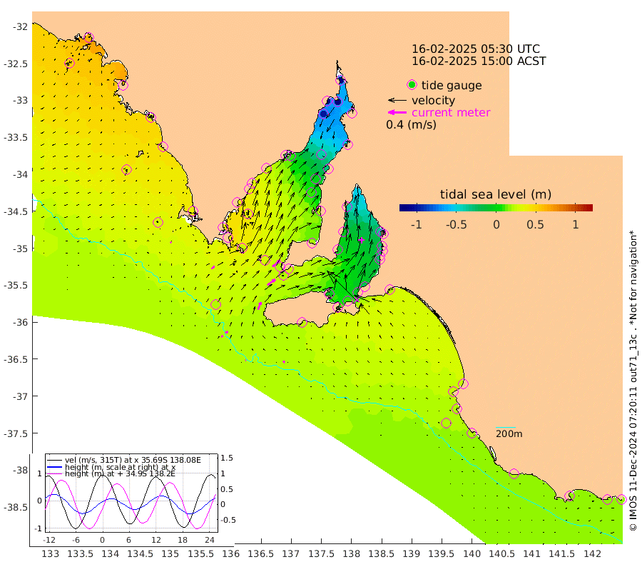 1cm/s 81T +10cm/s rms + 5cm/s 114T. SAM1DS 520m 8cm/s 56T +13cm/s rms + 5cm/s -36T. SAM2CP 100m 6cm/s 68T +21cm/s rms + 18cm/s 142T. SAM3MS 168m 4cm/s 128T +22cm/s rms + 0cm/s -30T. SAM4CY 117m 2cm/s -49T +23cm/s rms + 2cm/s 99T. SAM5CB 94m 21cm/s 55T +8cm/s rms + 3cm/s -172T. SAM6IS 83m 4cm/s 73T +11cm/s rms + 7cm/s 150T. SAM7DS 519m 21cm/s 49T +10cm/s rms + 2cm/s 87T. SAM8SG 47m 17cm/s 20T +20cm/s rms + 12cm/s -168T. NRSKAI 101m 17cm Warrnambool 18cm Port Fairy 18cm Portland 22cm Port Macdonnell 19cm Beachport 20cm Cape Rabelais (off) 22cm Robe 23cm Cape Jaffa 24cm Kingston 22cm Victor Harbor 23cm Vivonne Bay -6cm Kingscote -10cm American River 9cm Penneshaw -8cm Cape Jervis -23cm Second Valley -24cm Port Noarlunga -25cm Port Stanvac -29cm Brighton -27cm Glenelg -35cm Port Adelaide (Outer Harbor) -67cm Angus Inlet (Garden Island) -38cm Ardrossan -6cm Port Vincent -7cm Port Giles 27cm Stenhouse Bay 20cm Althorpe Island 22cm Pondalowie Bay 20cm Point Turton 19cm Port Victoria 10cm Cape Elizabeth -3cm Tiparra Reef Light -32cm Wallaroo -40cm Middle Bank -47cm Port Broughton -126cm Port Pirie -150cm Red Cliff Point (Beacon 5) -117cm Port Bonython -114cm Whyalla -99cm Western Shoal Beacon -19cm Franklin Harbor 8cm Franklin Harbor Entrance Beacon 23cm Arno Bay 34cm Port Neill 30cm Cape Hardy 35cm Tumby Bay 36cm Reevesby Island 43cm Port Lincoln 38cm Taylors Landing 23cm Whalers Bay 28cm Wedge Island Mooring 21cm Shelf Edge Mooring 37cm Coffin Bay Entrance Beacon 30cm Greenly Island 38cm Elliston 36cm Pearson Island 32cm Venus Bay 63cm Blanche Port (Streaky Bay) 62cm Thevenard 50cm St Francis Island