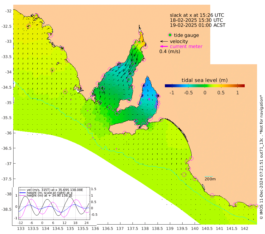 1cm/s -80T +10cm/s rms + 5cm/s 114T. SAM1DS 520m 3cm/s 67T +13cm/s rms + 5cm/s -36T. SAM2CP 100m 3cm/s 179T +21cm/s rms + 18cm/s 142T. SAM3MS 168m 5cm/s -55T +22cm/s rms + 0cm/s -30T. SAM4CY 117m 4cm/s 21T +23cm/s rms + 2cm/s 99T. SAM5CB 94m 1cm/s -153T +8cm/s rms + 3cm/s -172T. SAM6IS 83m 2cm/s -154T +11cm/s rms + 7cm/s 150T. SAM7DS 519m 2cm/s 164T +10cm/s rms + 2cm/s 87T. SAM8SG 47m 1cm/s -166T +20cm/s rms + 12cm/s -168T. NRSKAI 101m 25cm Warrnambool 23cm Port Fairy 24cm Portland 20cm Port Macdonnell 20cm Beachport 21cm Cape Rabelais (off) 22cm Robe 25cm Cape Jaffa 23cm Kingston 18cm Victor Harbor 19cm Vivonne Bay -37cm Kingscote -29cm American River -24cm Penneshaw -26cm Cape Jervis -43cm Second Valley -65cm Port Noarlunga -68cm Port Stanvac -70cm Brighton -72cm Glenelg -82cm Port Adelaide (Outer Harbor) -74cm Angus Inlet (Garden Island) -105cm Ardrossan -91cm Port Vincent -70cm Port Giles -4cm Stenhouse Bay 3cm Althorpe Island 2cm Pondalowie Bay -13cm Point Turton -15cm Port Victoria -18cm Cape Elizabeth -10cm Tiparra Reef Light -5cm Wallaroo -9cm Middle Bank 32cm Port Broughton 37cm Port Pirie 39cm Red Cliff Point (Beacon 5) 11cm Port Bonython 13cm Whyalla 14cm Western Shoal Beacon -19cm Franklin Harbor -24cm Franklin Harbor Entrance Beacon -22cm Arno Bay -24cm Port Neill -15cm Cape Hardy -10cm Tumby Bay -7cm Reevesby Island -3cm Port Lincoln 6cm Taylors Landing -6cm Whalers Bay 5cm Wedge Island Mooring 18cm Shelf Edge Mooring 22cm Coffin Bay Entrance Beacon 20cm Greenly Island 25cm Elliston 21cm Pearson Island 17cm Venus Bay 31cm Blanche Port (Streaky Bay) 32cm Thevenard 33cm St Francis Island