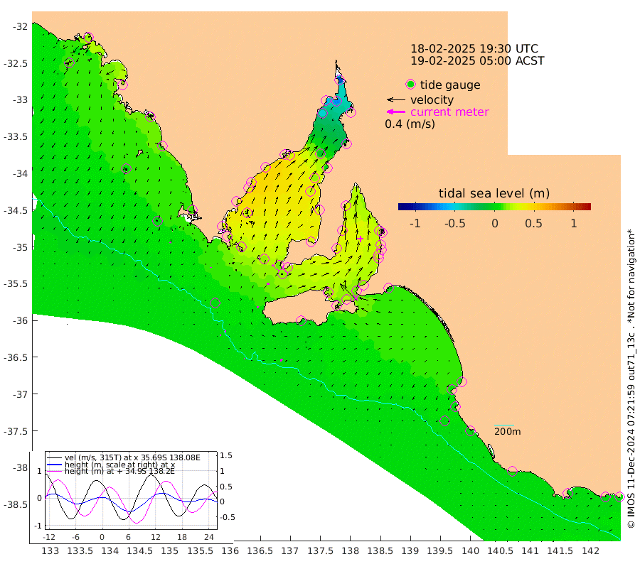 1cm/s -50T +10cm/s rms + 5cm/s 114T. SAM1DS 520m 1cm/s -179T +13cm/s rms + 5cm/s -36T. SAM2CP 100m 3cm/s 89T +21cm/s rms + 18cm/s 142T. SAM3MS 168m 5cm/s -126T +22cm/s rms + 0cm/s -30T. SAM4CY 117m 3cm/s -163T +23cm/s rms + 2cm/s 99T. SAM5CB 94m 6cm/s 94T +8cm/s rms + 3cm/s -172T. SAM6IS 83m 2cm/s 111T +11cm/s rms + 7cm/s 150T. SAM7DS 519m 4cm/s 111T +10cm/s rms + 2cm/s 87T. SAM8SG 47m 4cm/s 22T +20cm/s rms + 12cm/s -168T. NRSKAI 101m 2cm Warrnambool 2cm Port Fairy 1cm Portland 9cm Port Macdonnell 0cm Beachport 2cm Cape Rabelais (off) 4cm Robe 7cm Cape Jaffa 6cm Kingston 5cm Victor Harbor -1cm Vivonne Bay 18cm Kingscote 14cm American River 20cm Penneshaw 13cm Cape Jervis 16cm Second Valley 22cm Port Noarlunga 24cm Port Stanvac 24cm Brighton 27cm Glenelg 25cm Port Adelaide (Outer Harbor) -1cm Angus Inlet (Garden Island) 35cm Ardrossan 39cm Port Vincent 36cm Port Giles 21cm Stenhouse Bay 19cm Althorpe Island 15cm Pondalowie Bay 28cm Point Turton 27cm Port Victoria 25cm Cape Elizabeth 16cm Tiparra Reef Light -2cm Wallaroo -5cm Middle Bank -9cm Port Broughton -77cm Port Pirie -86cm Red Cliff Point (Beacon 5) -71cm Port Bonython -60cm Whyalla -47cm Western Shoal Beacon 13cm Franklin Harbor 27cm Franklin Harbor Entrance Beacon 31cm Arno Bay 39cm Port Neill 33cm Cape Hardy 33cm Tumby Bay 23cm Reevesby Island 27cm Port Lincoln 17cm Taylors Landing 25cm Whalers Bay 15cm Wedge Island Mooring 0cm Shelf Edge Mooring 8cm Coffin Bay Entrance Beacon 1cm Greenly Island 10cm Elliston 5cm Pearson Island 13cm Venus Bay 21cm Blanche Port (Streaky Bay) 17cm Thevenard 13cm St Francis Island